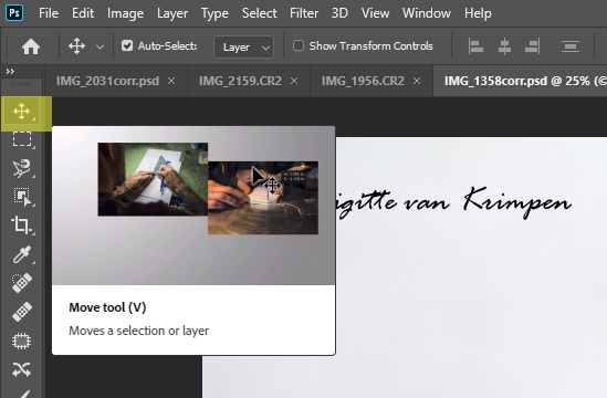 Om je veranderingen definitief te maken druk je op het vinkje (groen gehighlight). Mocht je tekst niet helemaal op de juiste plek staan, klik dan 1 maal (L) op de tekst laag en verplaats deze met het Move / verplaats gereedschap dat te vinden is boven in je linker gereedschapsbalk. Je kan ook de snelkoppeling V hiervoor gebruiken.