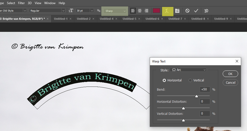 Mocht je tekst willen maken in een vorm (meerdere keuzes mogelijk) selecteer dan opnieuw je tekst laag door er dubbel op te klikken (zie: boven) en kies boven in de menubalk (geel gehighligt) de gewenste vorm. Tevens kan je ook nog de scherpte van de letters in deze menubalk aanpassen (groen/grijs gehighlight)