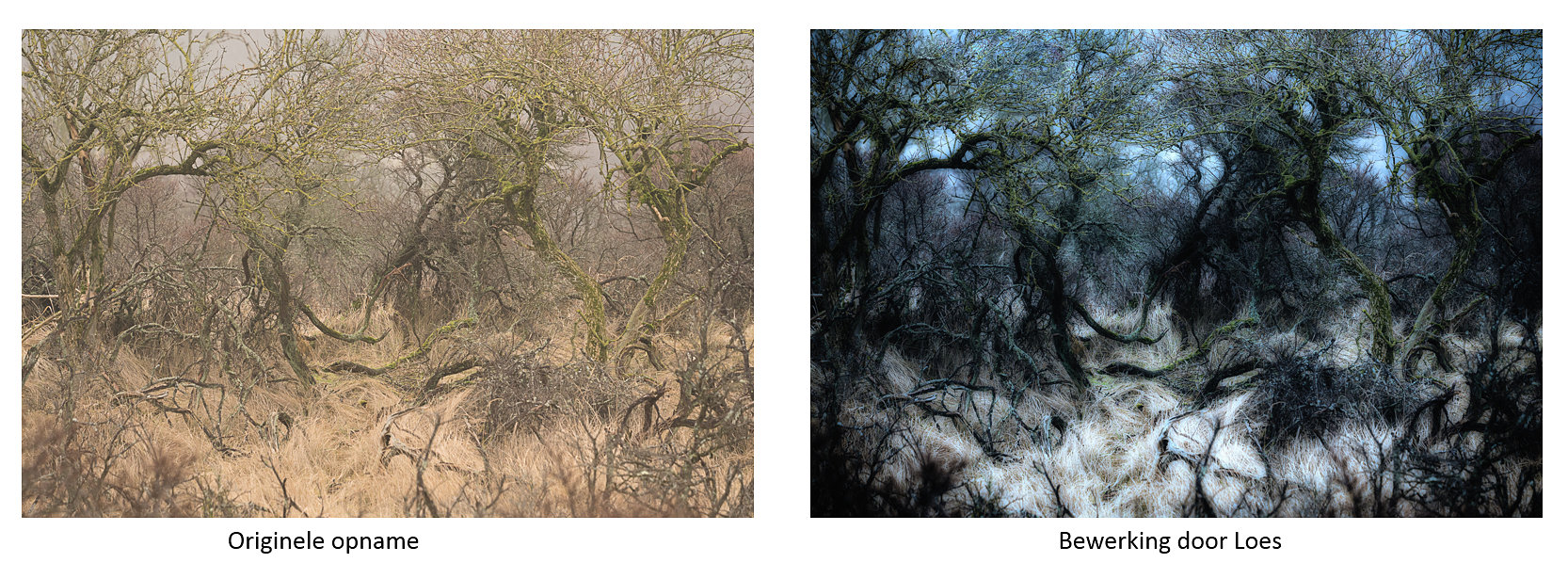 Loes: Waar bewerking 1 er uitspringt door de kleuren, vind ik hier juist de monochrome kleurstelling heel fraai, die geeft rust in de chaos. De dunne takjes in de voorgrond zorgen voor een mooi kader en geven wat diepte, knap gedaan, maar ik zie er wel een bewerkingsfoutje in, namelijk een horizontale lijn in het midden, dat is wel een klein minpuntje.