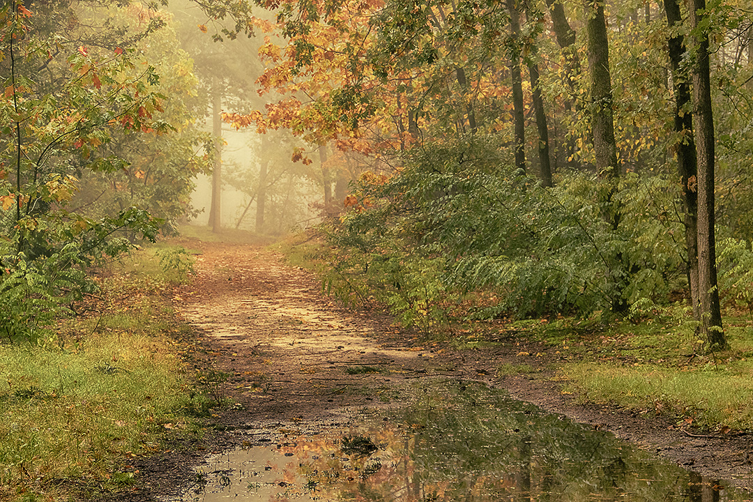 Ik heb geprobeerd wat meer nadruk te leggen op het lichte deel in de verte, de herfstkleuren en de reflecties daarvan in de plassen.