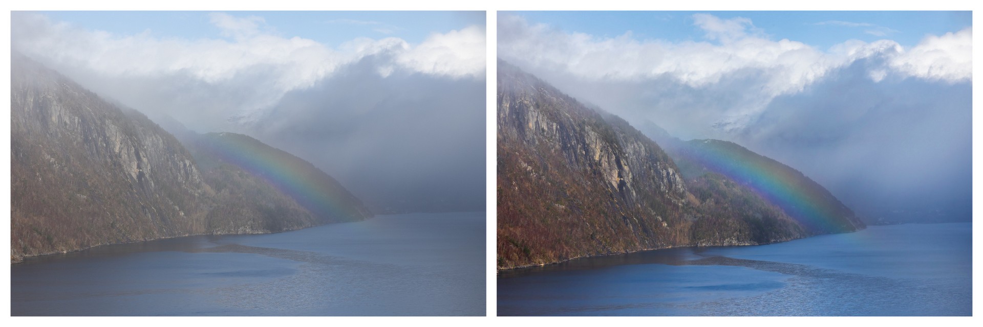 Ronald: Het beeld heeft duidelijk wat meer contrast en daardoor pit gekregen. Persoonlijk vind ik de rotswand en de regenboog iets té, maar de lucht daarentegen spreekt mij meer aan.