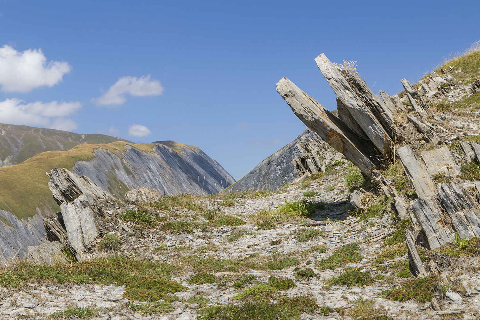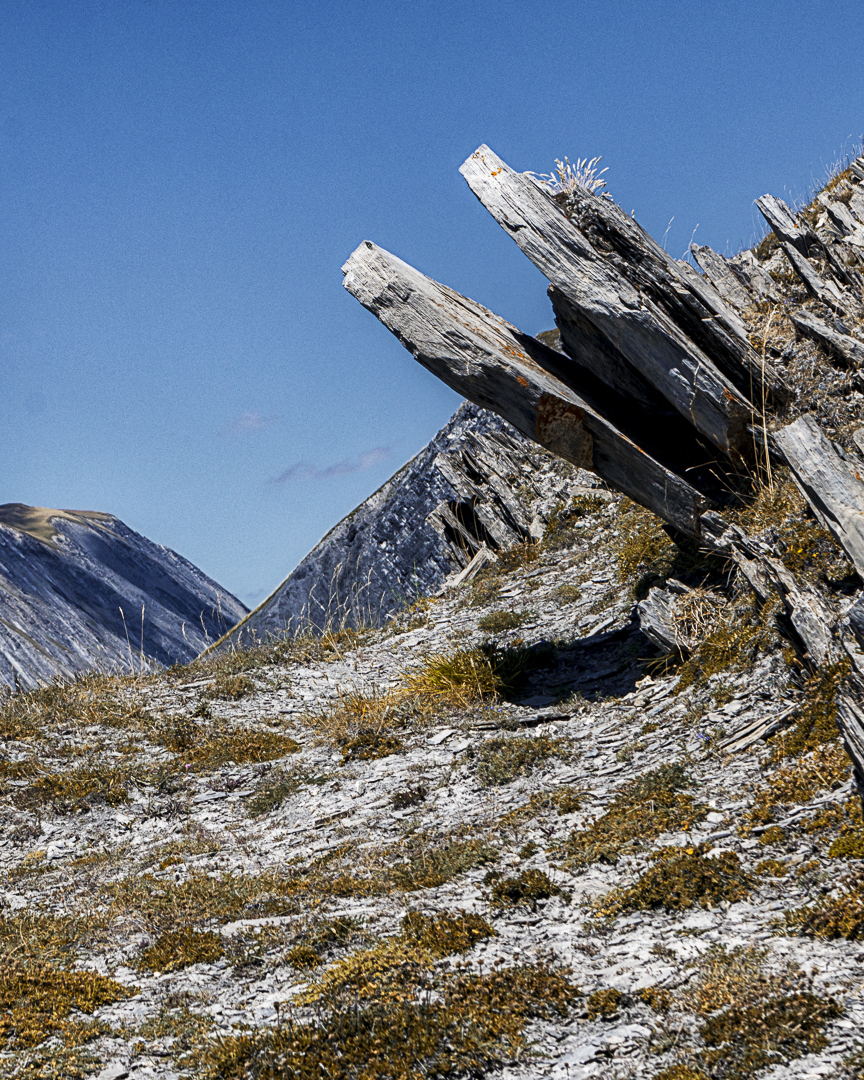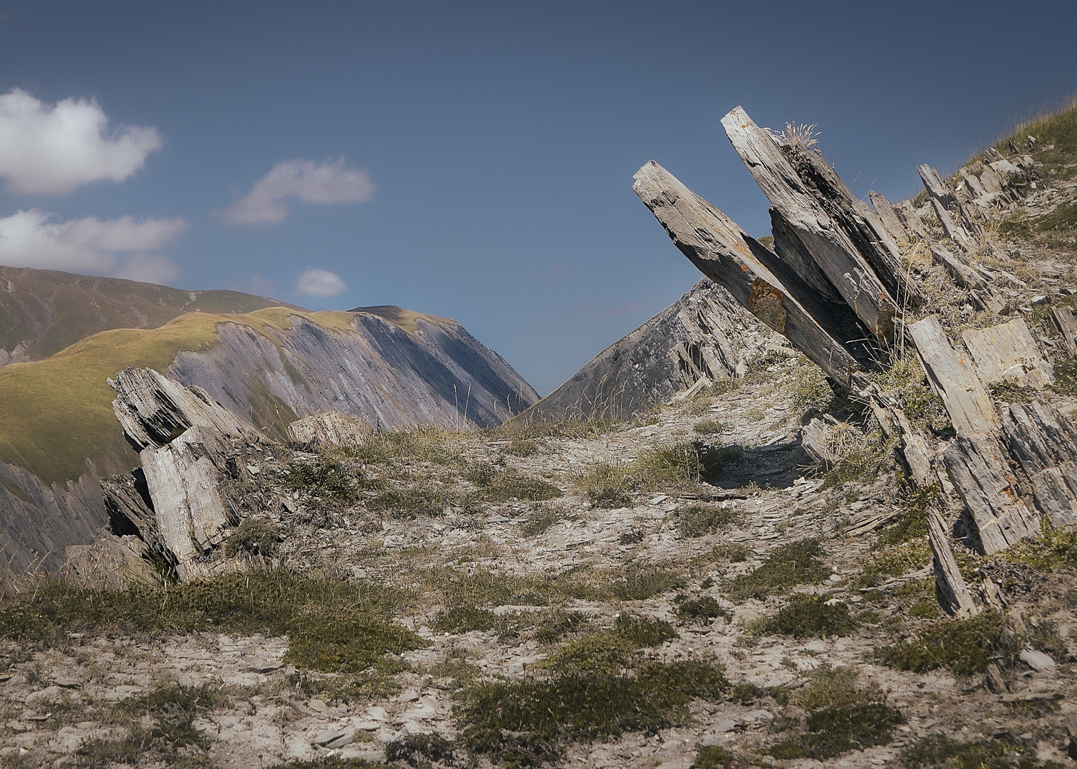 Ik zie een weids berglandschap in zachte kleuren, zo te zien ruim boven de boomgrens, onder een strakblauwe lucht met aan de linkerkant enkele wolken. In dat landschap zijn twee rotsformaties die als een soort kristallen uit de grond tevoorschijn komen.