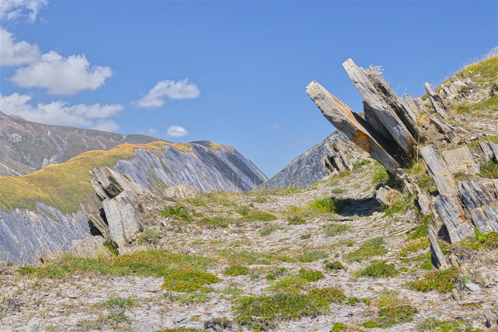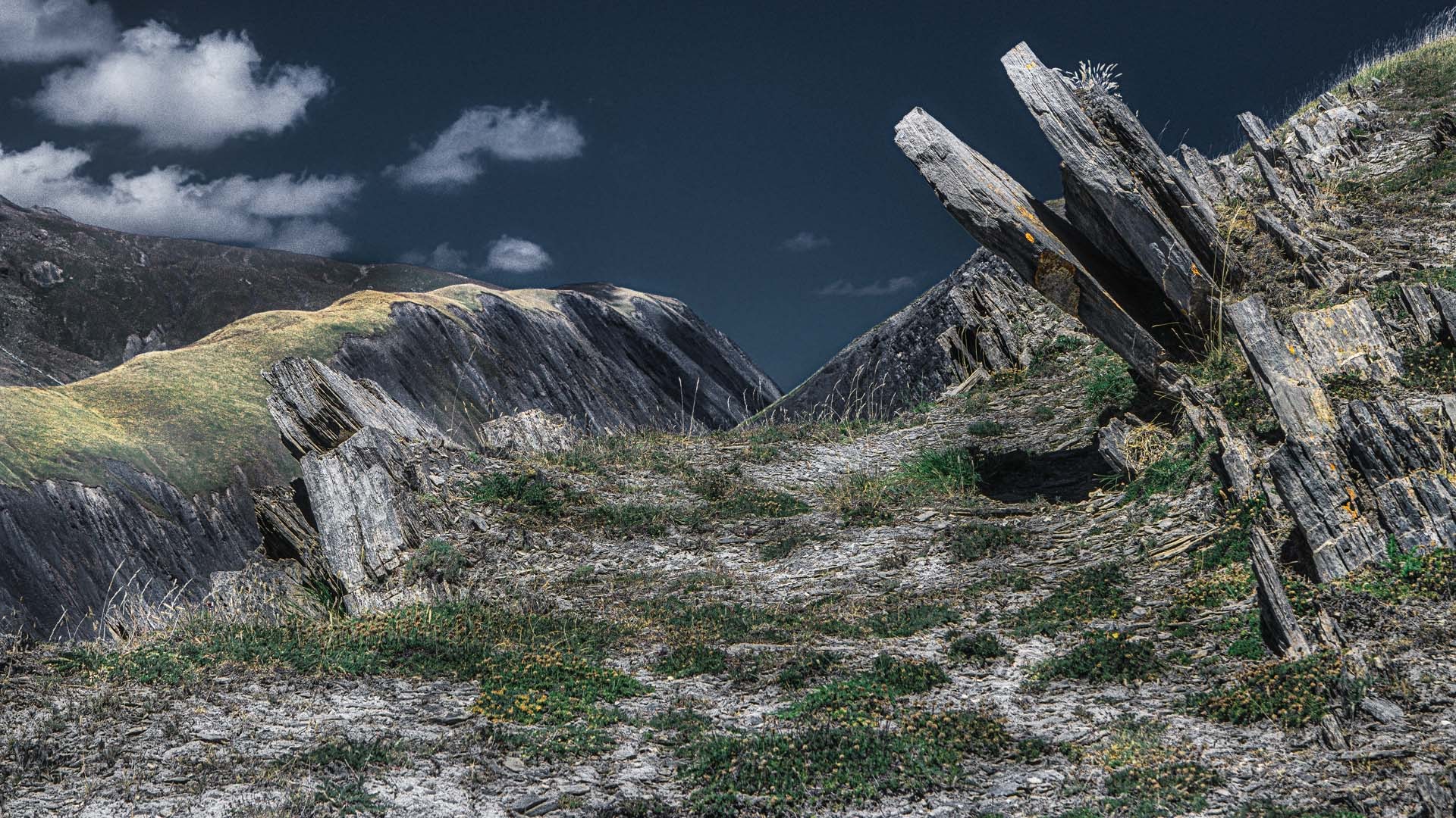 - Kleuren wat aangezet, vooral om de korstmossen wat meer kleur te geven en de roodbruine delen van de andere begroeiing wat beter zichtbaar te maken. Omdat dit de bergwand links wat blauwig maakte, heb ik daarvan de verzadiging wat teruggeschroefd.