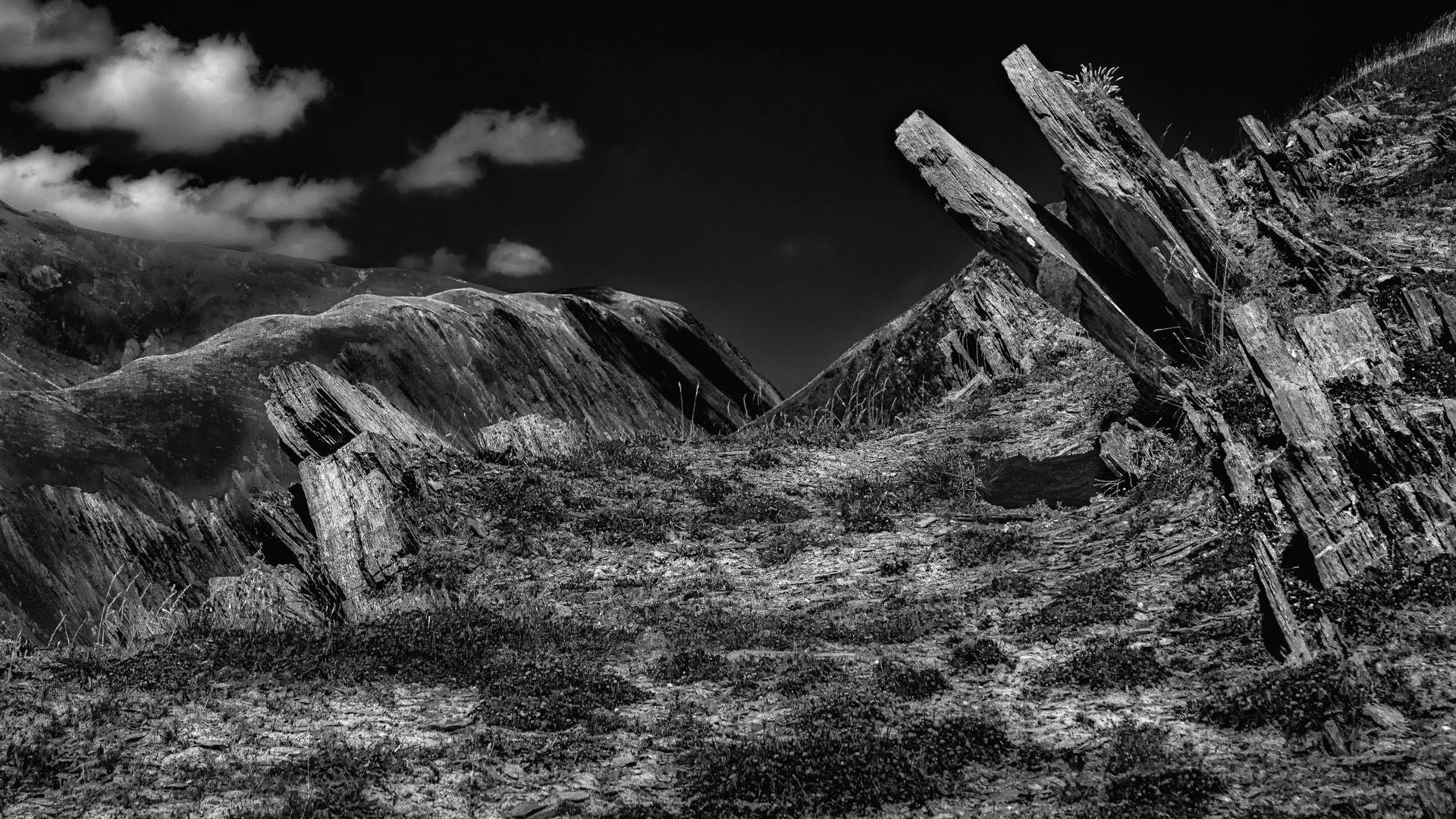 Vooral de twee rotspartijen springen eruit in de foto. Alle bewerkingen hebben tot doel gehad om ze meer in de kijker te zetten. Tijdens de ontwikkeling heb ik o.a gedeeltes rondom deze rotspartijen wat donkerder aangezet. Ook de lucht is donkerder gemaakt en tegelijk heb ik blauw minder verzadigd omdat de lucht te veel aandacht vroeg. Dat is meteen ook de reden dat de uitsnede 16x9 is geworden. Een deel van de lucht is er af gesneden zodat de rotsen nu meer aandacht krijgen.