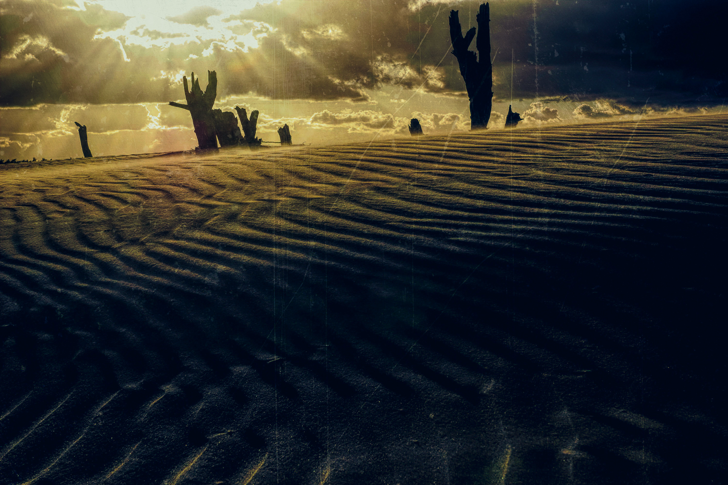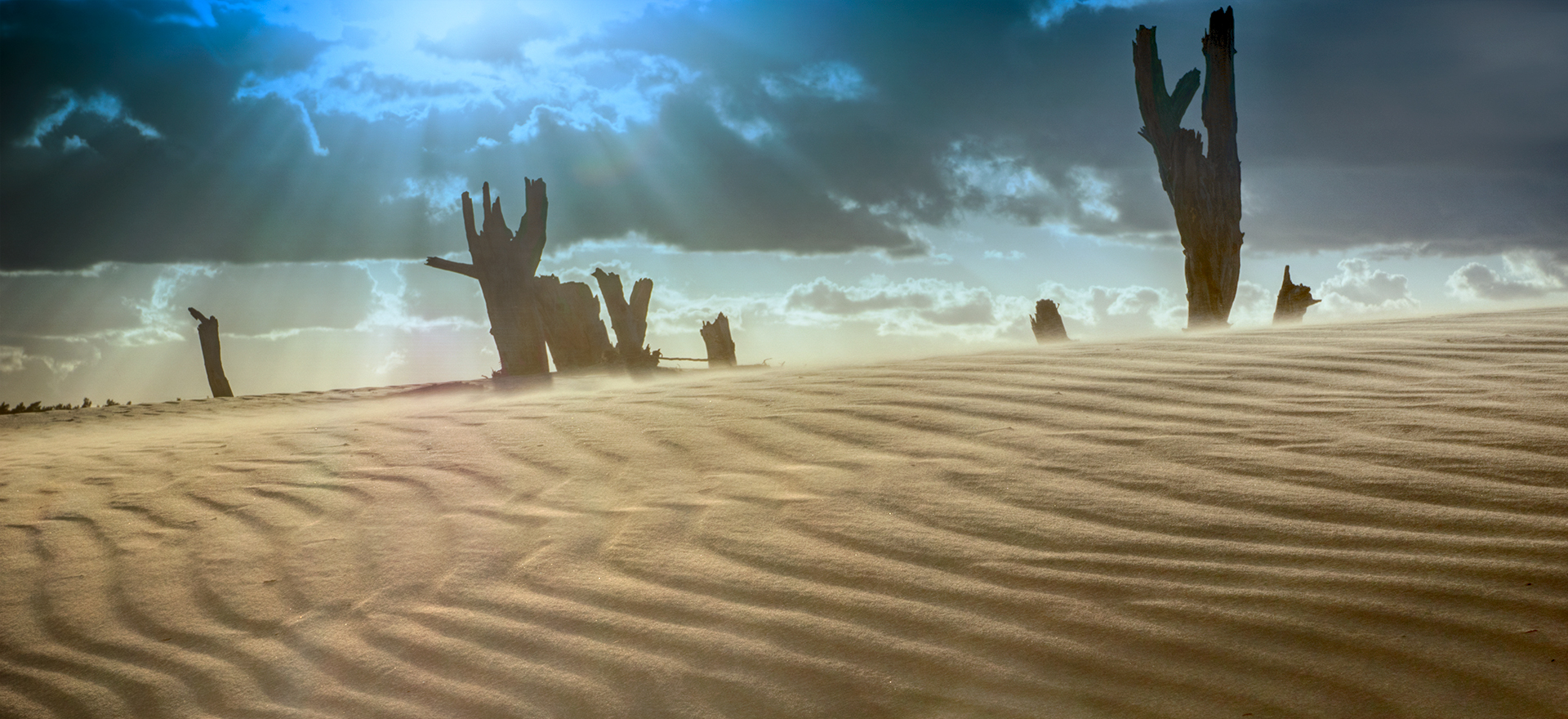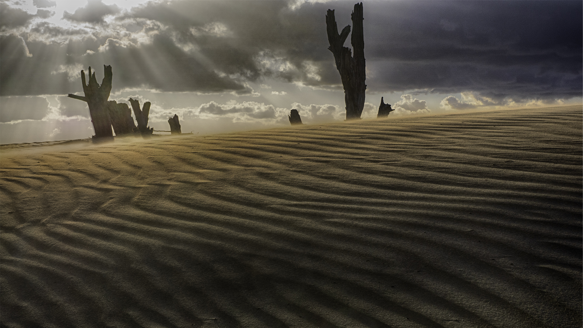 Ik vond de foto mooi maar wat te lief. Deed me denken aan western. Ik wilde meer dreiging geven en een " oude" look. Eerst in Lightroom standaard met de schuifjes gespeeld, niks bijzonders. Toen in Topaz Studio 2 AI-clean en precision contrast en precison detail toegepast. Daarna Nik analog efex pro. Een blauwe tint toegevoegd via een filmstrip (cool) en dirt en scratches toegevoegd. Ook wat meer contrast en en brightness wat minder. Wel geprobeerd de lijnen in het zand zichtbaar te houden.