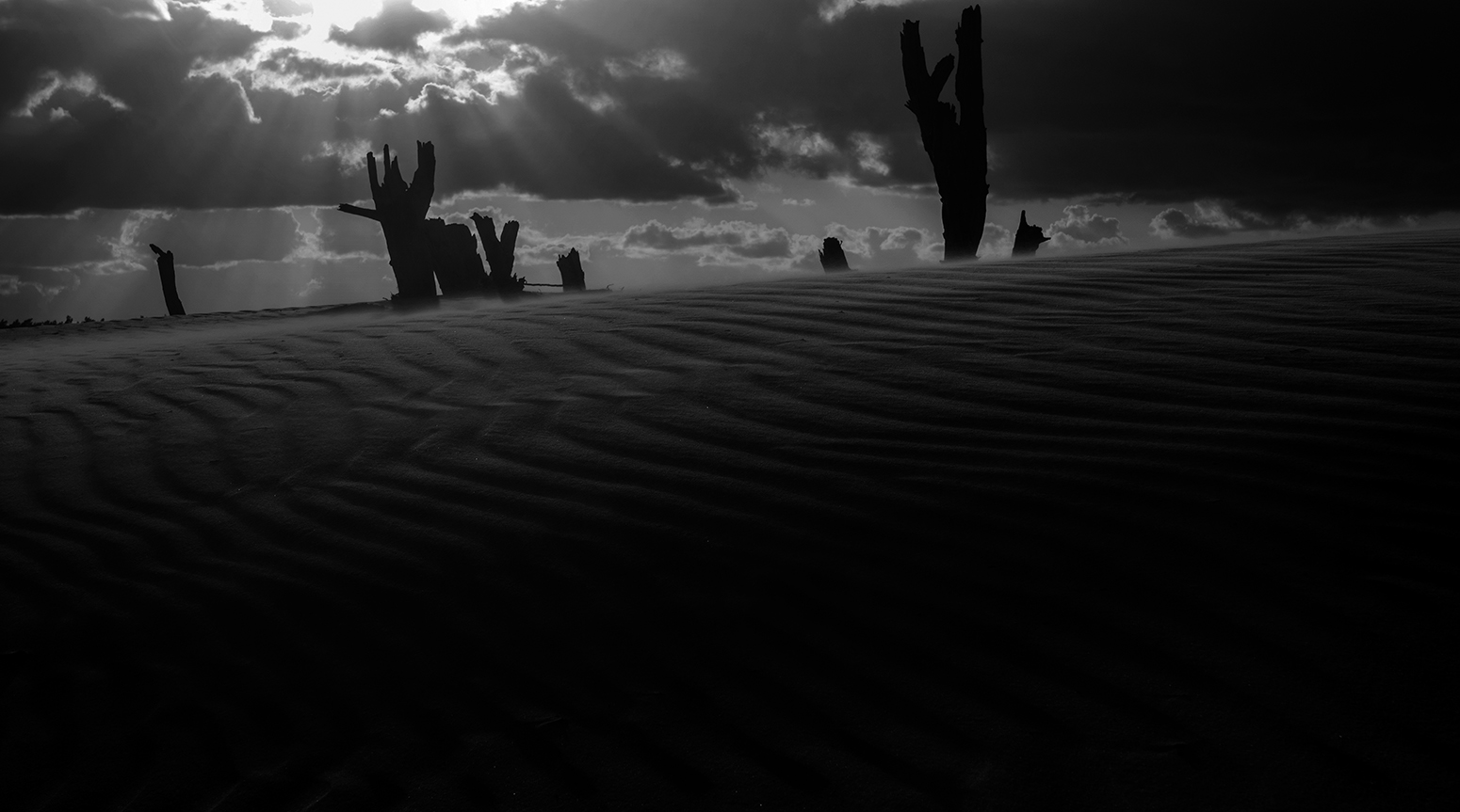 Bas: Hier blijkt dat de foto zich ook goed leent voor omzetting naar zwart wit. In combinatie met de panorama uitsnede heeft ook deze foto een groter dramatisch effect gekregen. Jammer vind ik dat de foto naar rechtsonder wel erg dichtloopt en er weinig of geen doortekening meer is. Wellicht had het geholpen als met een graduated filter de onderzijde van de foto qua niveaus meer uit elkaar was getrokken. Nodigt uit tot een nieuwe poging wat mij betreft.