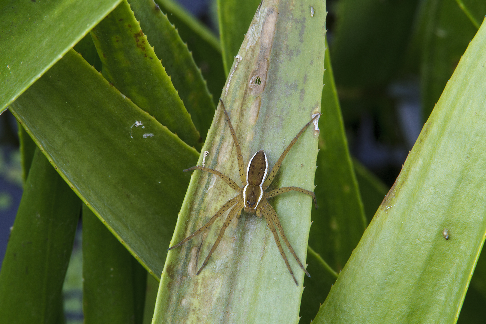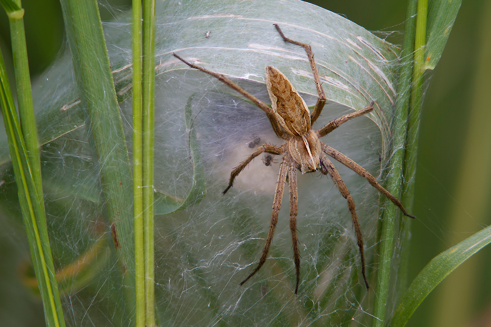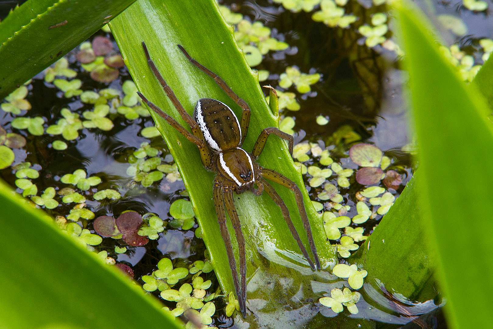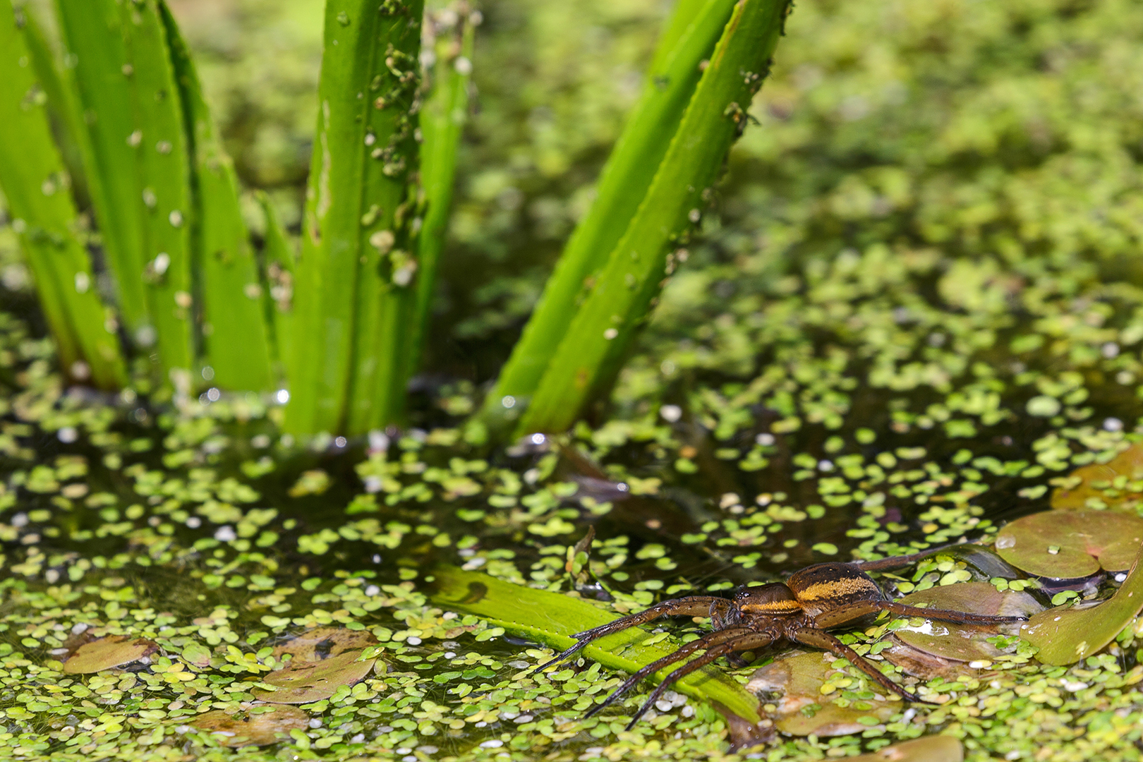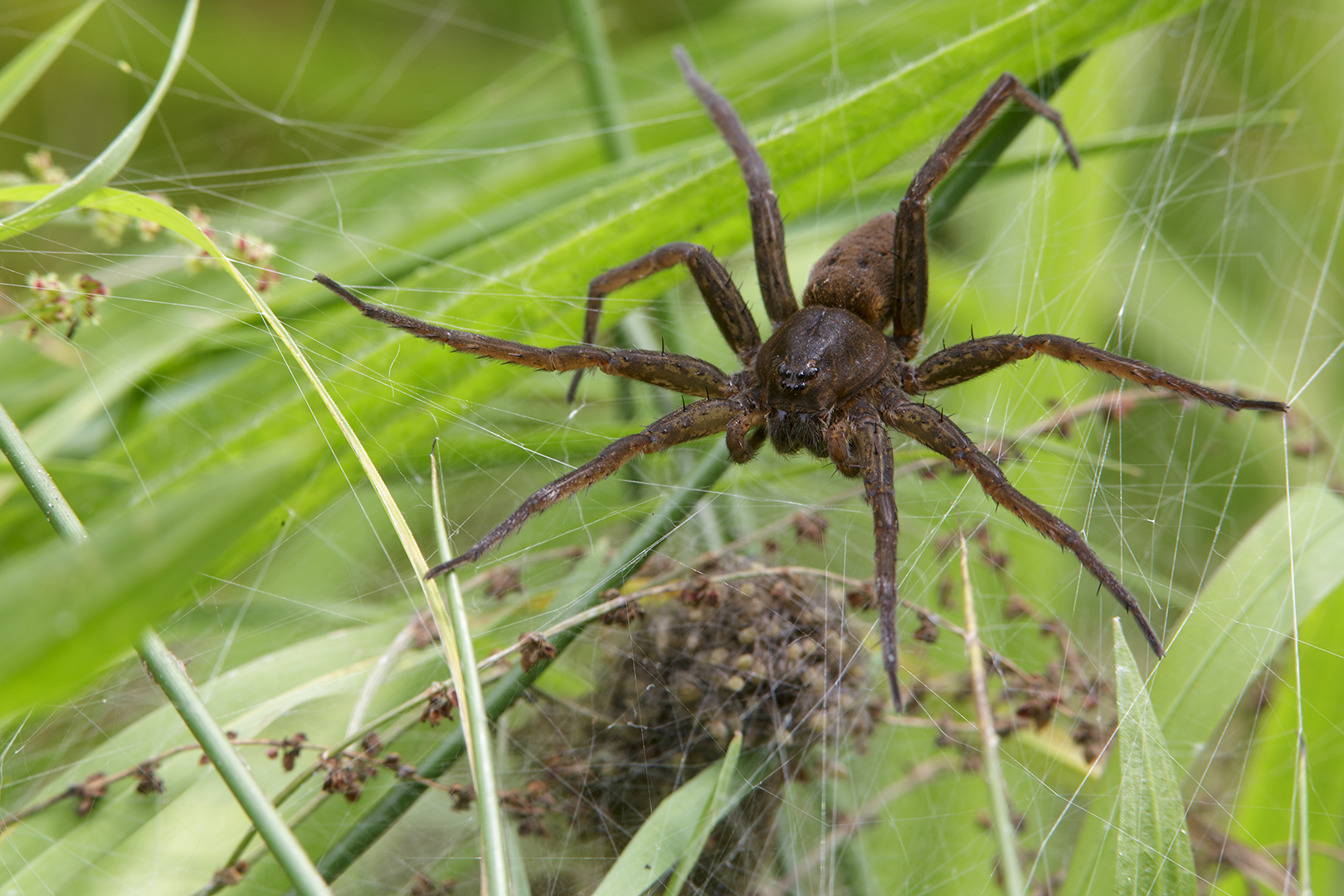 De Grote gerande oeverspin (Dolomedes plantarius). Dit is de grootste spin die we in Nederland tegen kunnen komen. Het is een vrij zeldzame soort die o.a. in de kop van Overijssel leeft. Ze heeft een voorkeur voor sloten en plasjes met een begroeiing van krabbenscheer. Het wijfje draagt haar eitjes in een eicocon in haar kaken met zich mee. Kort voor het moment van uitkomen weeft ze een koepelvormig web (vaak in krabbenscheer) waarin ze de cocon ophangt. Een cocon kan wel 300 jongen bevatten die nog een tijd door de moeder bewaakt worden.