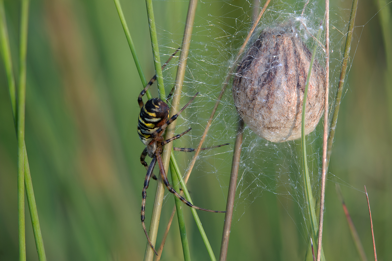 P.S. Verleden week bezocht ik een gebiedje in de buurt waar ik een paar jaar geleden meerdere exemplaren van de wespspin aantrof, maar ik zag er geen een. Bij de auto aangekomen zat er opeens een op mijn broekspijp. Ik probeerde haar nog te pakken maar ze viel in het hoge gras en ik vond haar nooit meer terug.