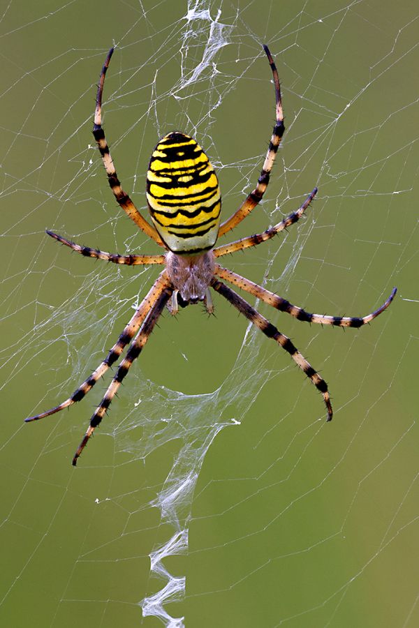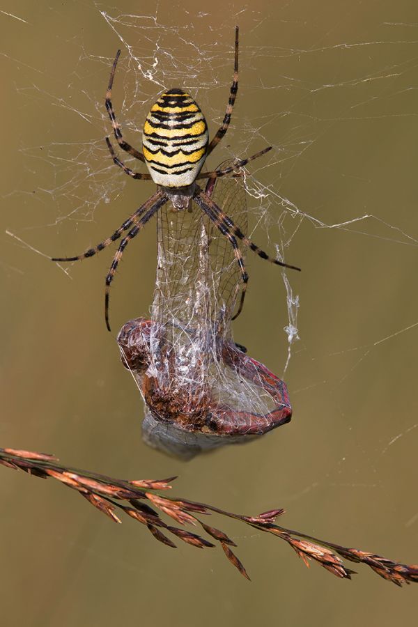 Kenmerkend voor deze bijzondere soort zijn de geringde poten en het geelzwart gebandeerde achterlijf, waar zij ook haar naam aan dankt. Ze hangt altijd ondersteboven in haar web. Een mooi voorbeeld van mimicry trouwens waarbij de geelzwarte afschrikkleuren voorkomen dat ze opgegeten wordt door vogels en andere insectenetende dieren. In het midden van het web, de plek waar de spin meestal verblijft, zit een dichtgeweven zigzagband, het stabilimentum. De functie hiervan is nog niet bekend.