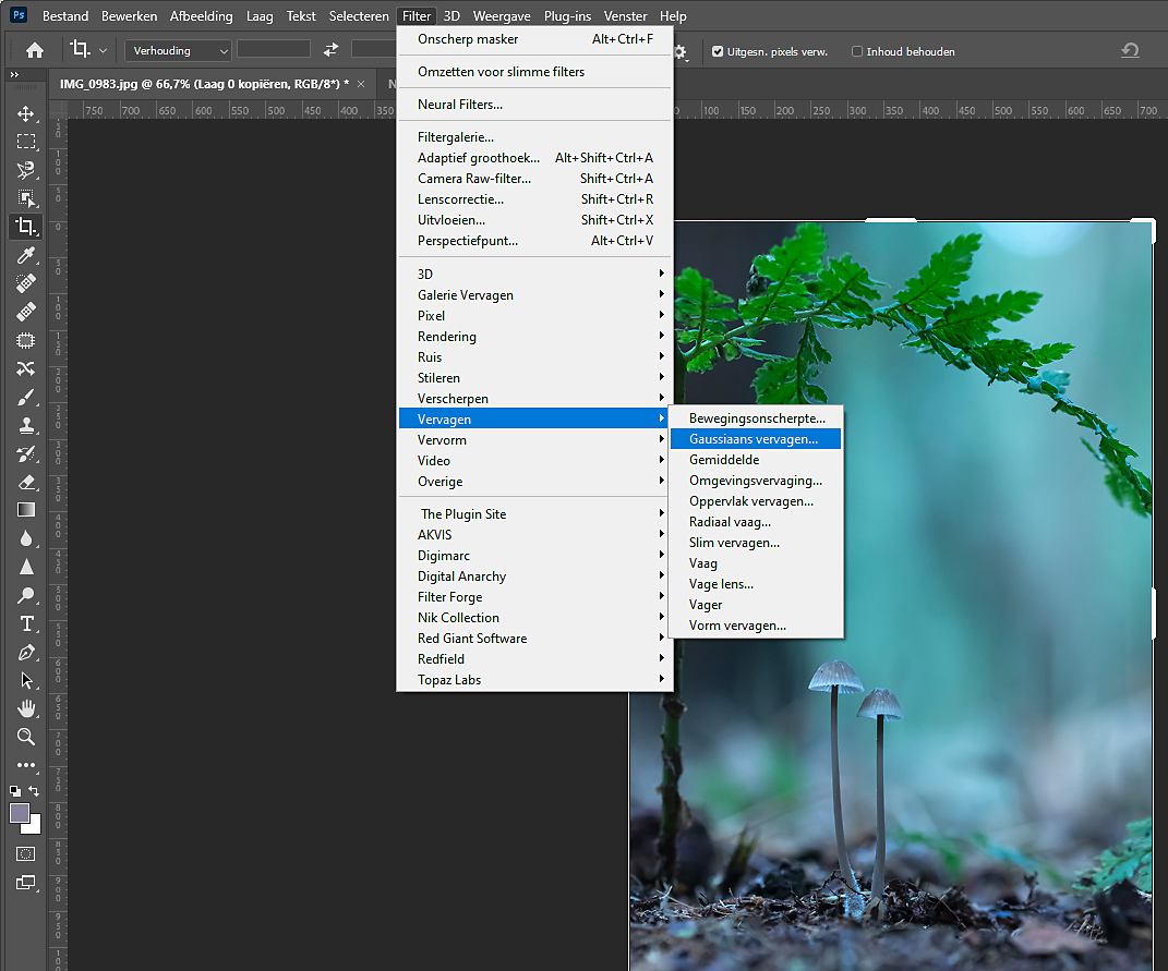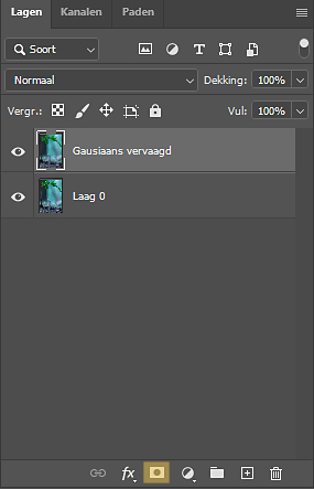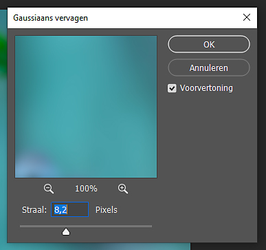 • Ga op de copy laag staan en kies in de menubalk boven Filter>Vervagen>Gaussiaans vervagen.