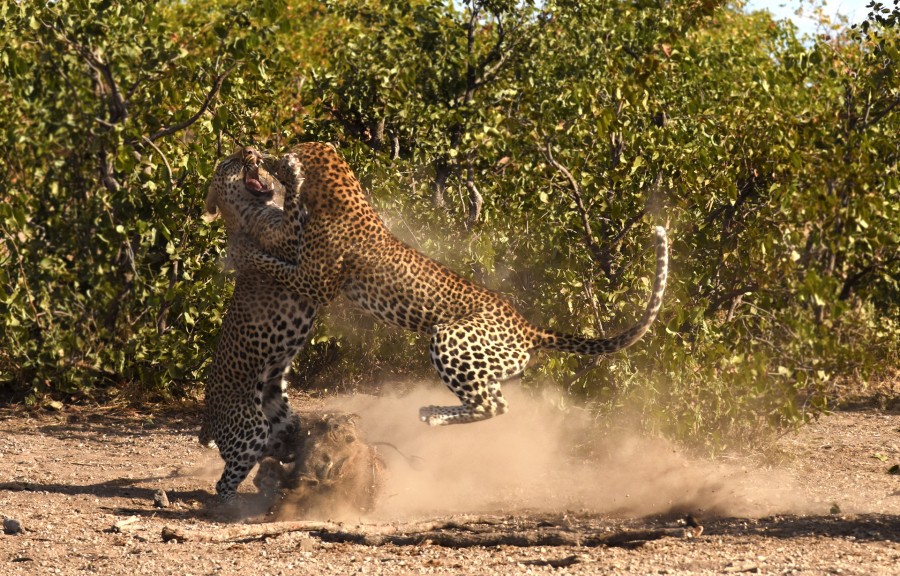 Grote Rafelvis Bovenwater; het vechten om een wrattenzwijn tussen 2 luipaarden afgelopen juni in Zuid Afrika