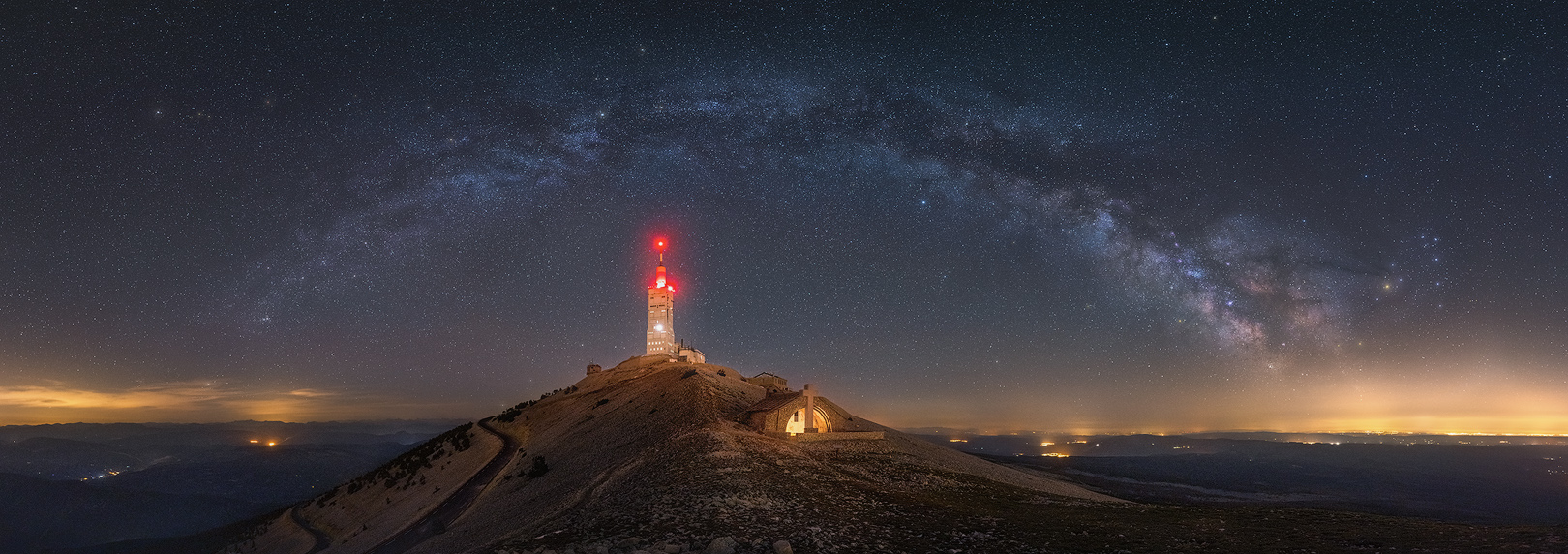 Voor veel fietsers is dat een berg met bijna mythische proporties. Voor de ultieme Melkwegfoto had ik uitgezocht hoe ik een Melkwegpanorama zou kunnen maken waarin de Melkweg zich als een boog over de spits van de berg buigt. Voor dit plan moest ik wel in april of mei naar de Mont Ventoux, hopen op goed weer en boven zien te komen. Midden in de nacht uiteraard.