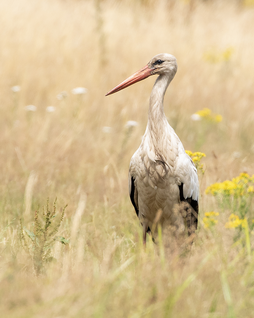 Zelden zie je een ooievaarfoto in een bloemenweide. Ik vond hem prachtig kleuren in deze ietwat uitgedroogde en gelige omgeving. Er was hier niet veel te halen aan voedsel. De 2 bijbehorende poelen staan ook redelijk droog en werd door een drietal blauwe reigers al leeggehaald. De ooievaar was dan ook weer snel vertrokken.