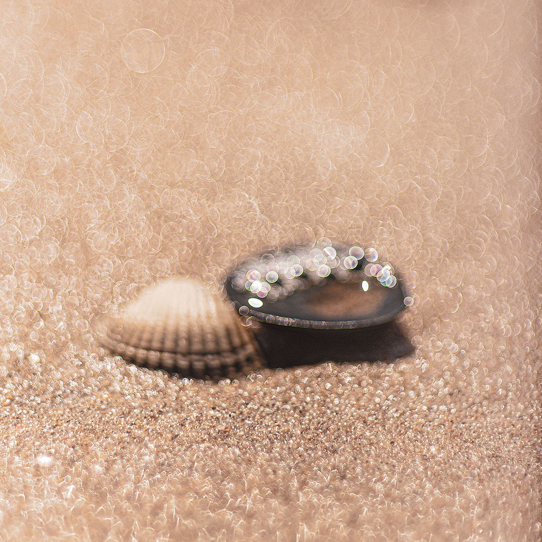 Lage opname van de schelpen op het strand met veel bokeh eromheen. Gemaakt met de Helios 44-2.