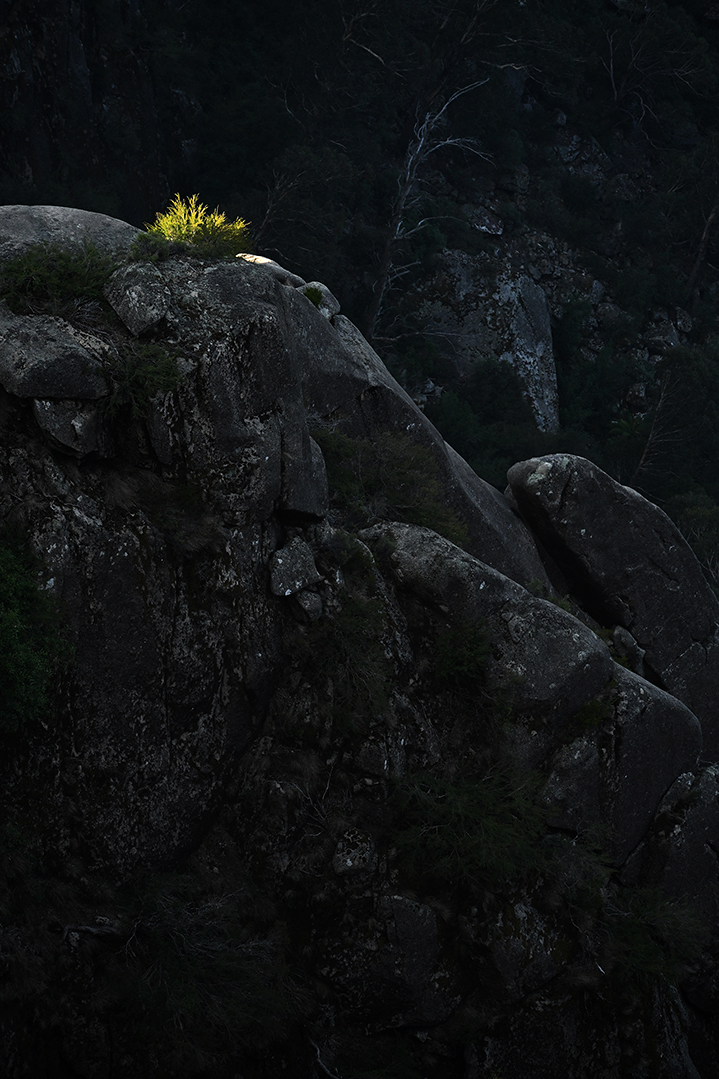 Op een hoog gelegen uitkijkpunt in de diepte kijkend viel mij een plukje gras in een verder zwarte omgeving op. Dit vastgelegd.