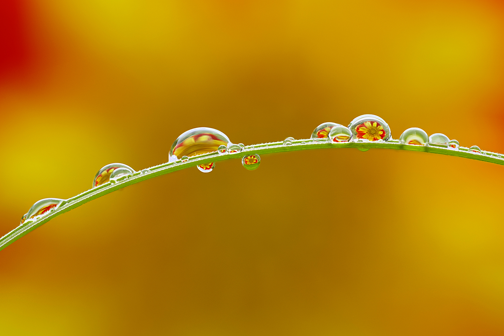 Op een grasspriet onder de dauw werkten de druppels mooi als lens voor de kleurrijke achtergrond, een dahlia.