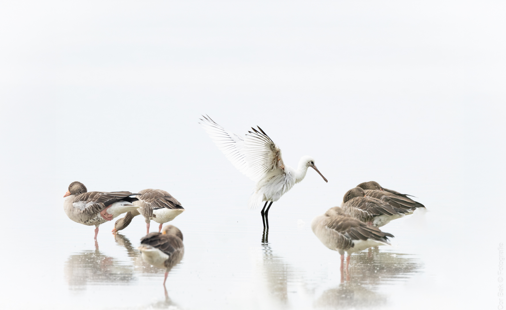 Ze blijven mooi, lepelaars in de vlucht, bij een landing. Mijn voorkeur gaat dan altijd uit naar een frisse High Key setting.