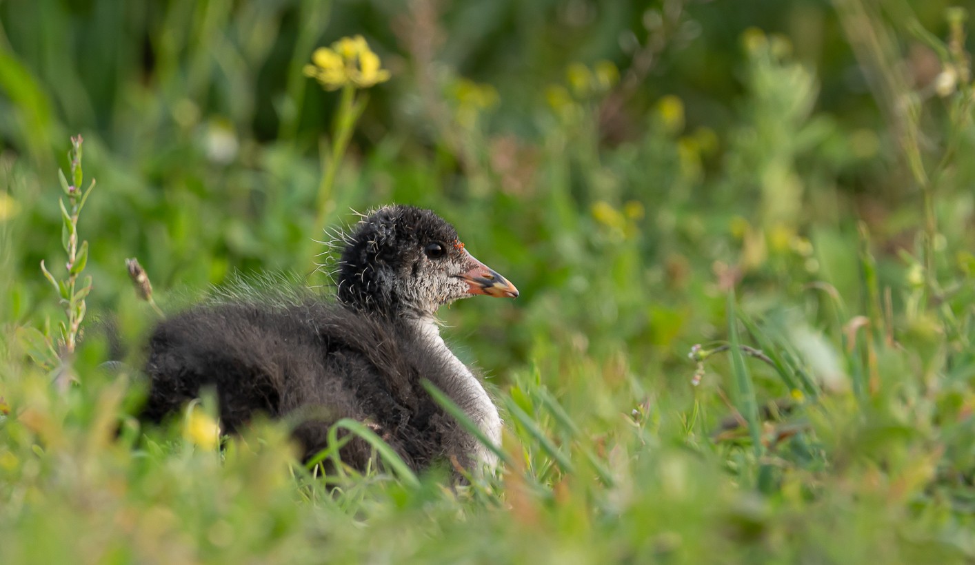 Ik vind het altijd wel een uitdaging om een doodgewone vogel wat minder gewoon in beeld te zetten. Vroege ochtend, tegenlicht, nat weiland, wachten tot de meerkoet even op de goede plek in het slootje komt: En klik.