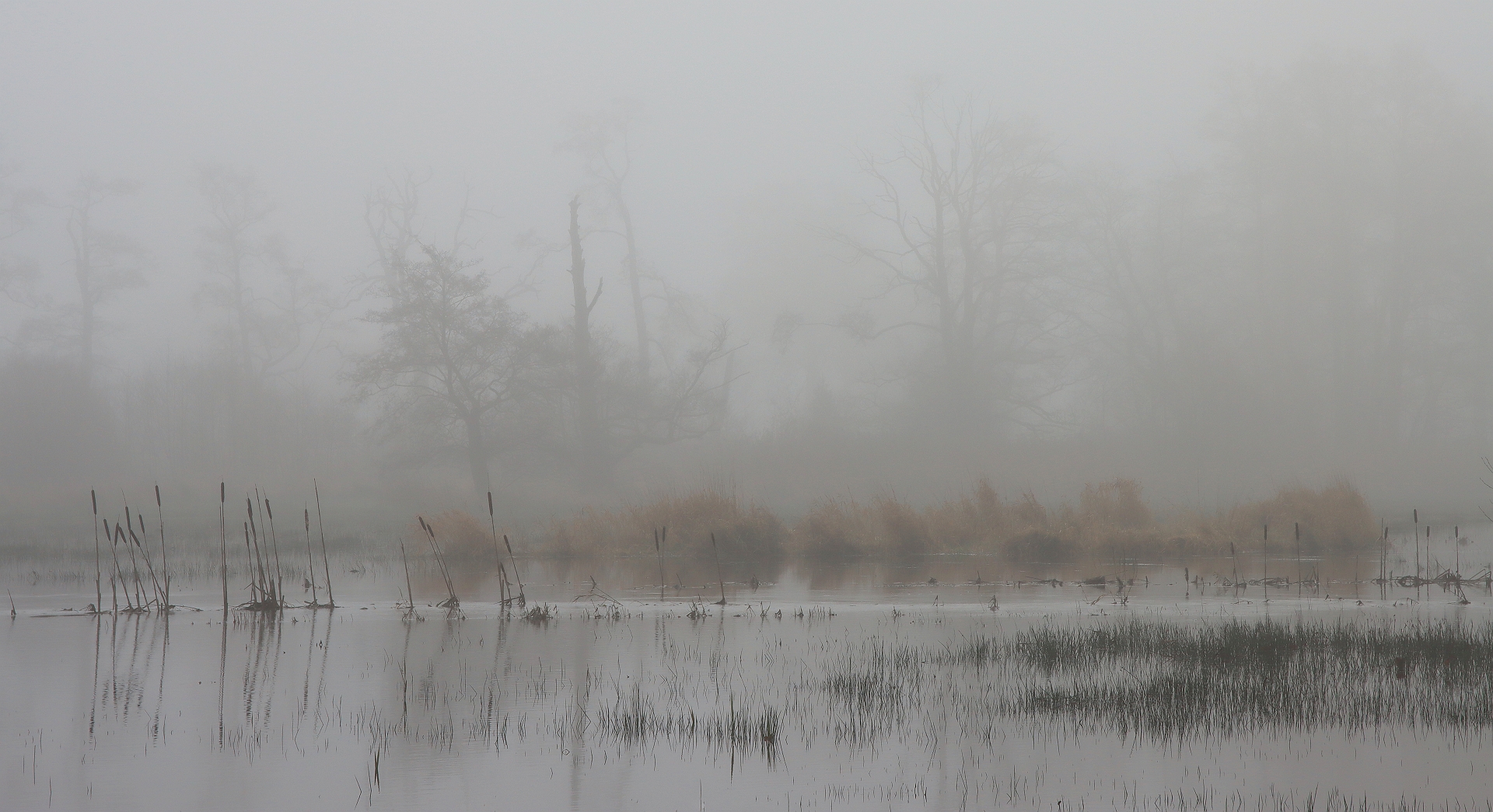 Vanochtend genoten van de omstandigheden! Deze setting sprong eruit zo in de mist, en het was wachten totdat er een dodaars of koet doorheen zou zwemmen. Gelukkig kwam het zo uit.