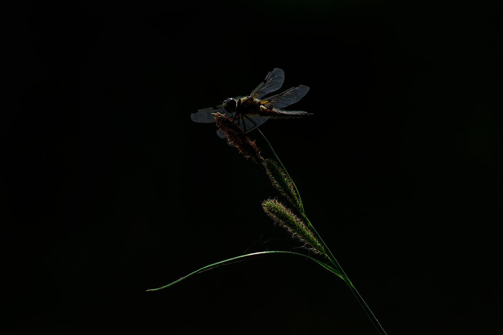 Dit eendagsvliegje zat voor een kier tussen de halfronde houten palen van de schuur. Van binnen naar buiten gefotografeerd, gebruik makend van het tegenlicht, aanvankelijk met het idee er een silhouet van te maken. Dat lukt niet helemaal omdat de kier te smal was en leverde ook geen spannend beeld op. Flink onderbelicht en ledpaneeltje (op statief buiten) ingezet om er een mysterieus doorkijkje van te maken (wat overigens nog niet meeviel).
