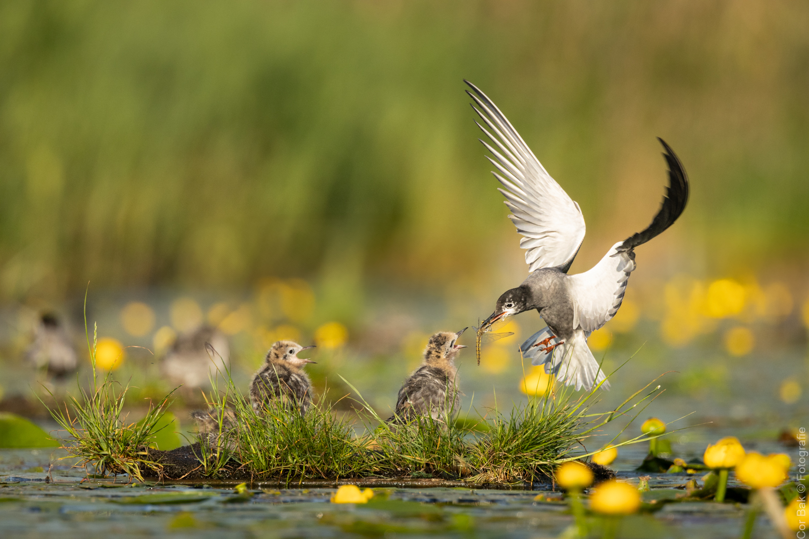 Op het eerste nest zaten nog geen jonge zwarte sterns. Van het tweede nest waren er nog twee van de drie jonge sterns over maar die deden zich tegoed aan de visjes en insecten die met regelmaat door de ouders werden gebracht. Zo fascinerend dat ze exact de geluiden van hun ouders herkennen voordat ze aan komen vliegen. Dan staan ze rechtop met de bekjes helemaal open te wachten.