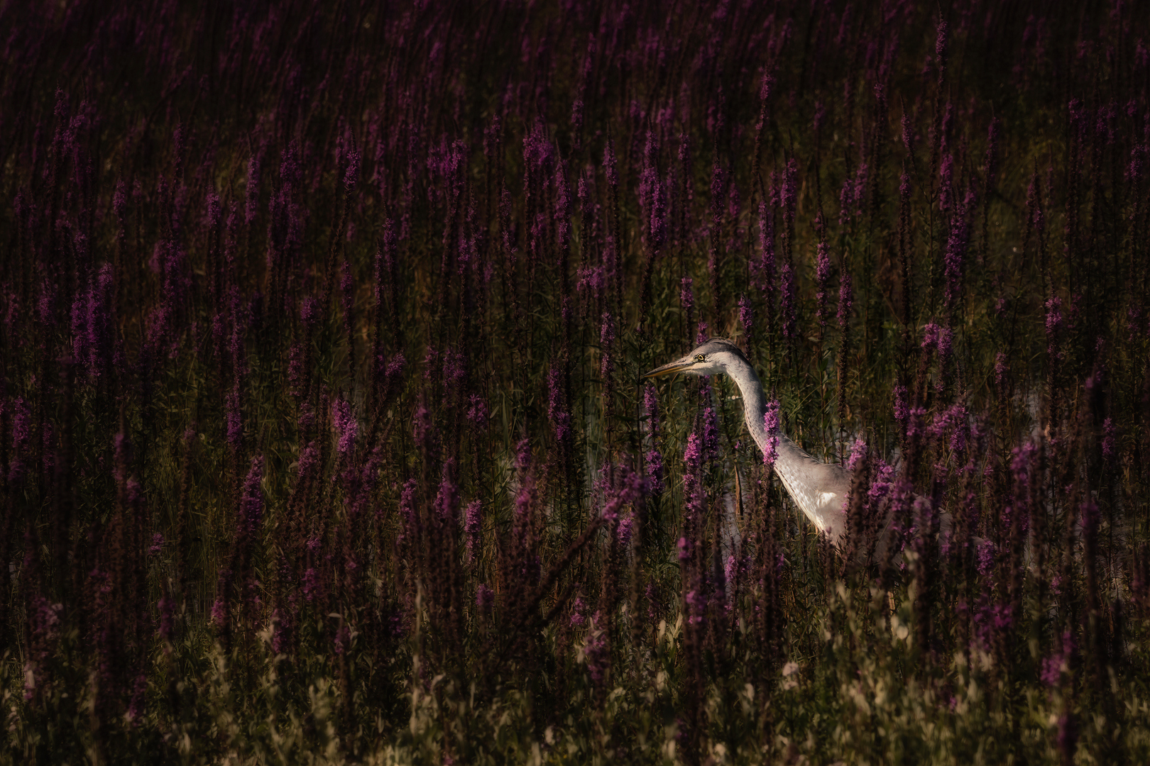 Blauwe reiger tussen de paarse kattenstaarten - Loes Belovics