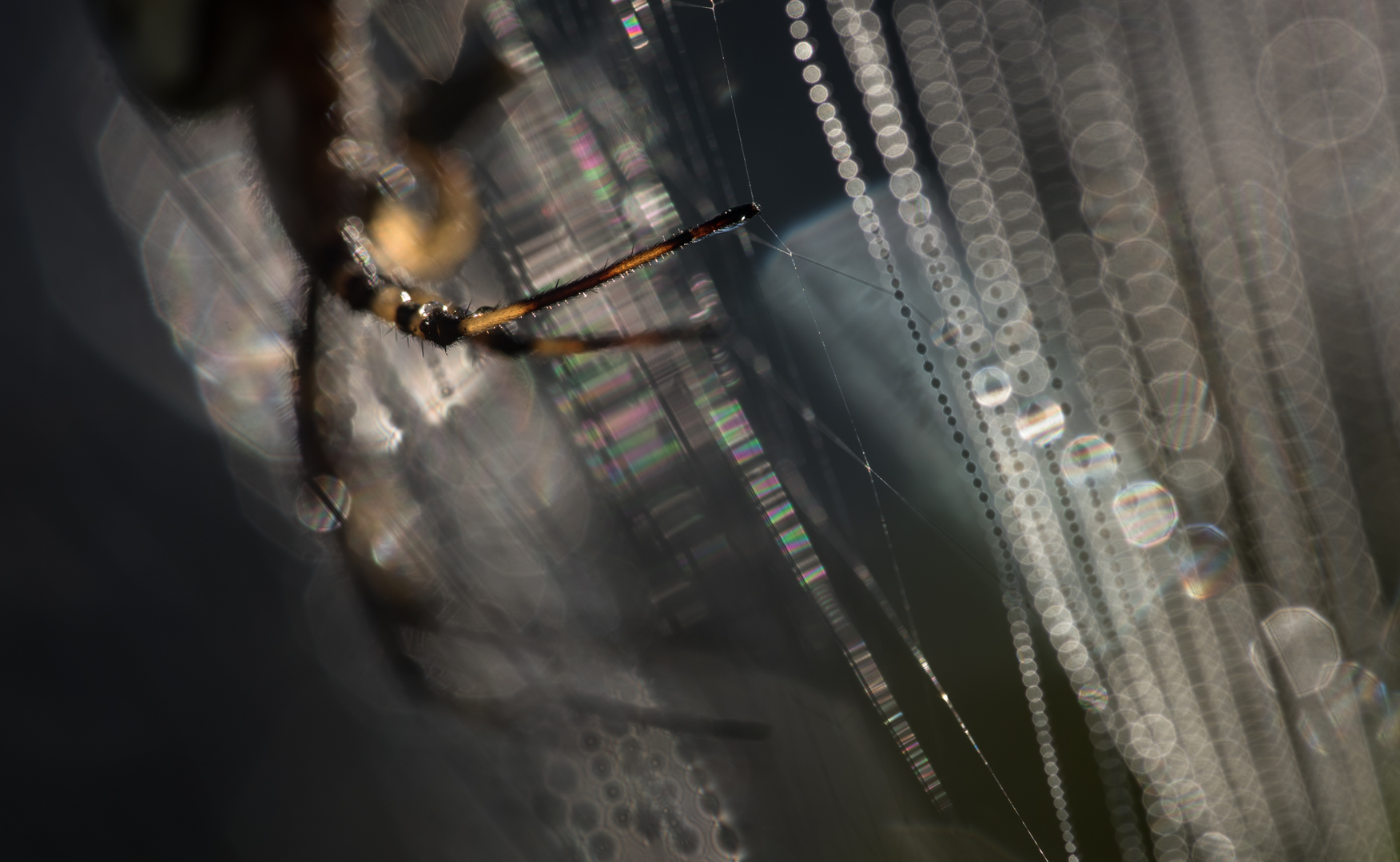 Foto van een tijgerspin. Van een spin gaat dreiging uit. Om dat te benadrukken is gekozen voor een klein detail en gefotografeerd met een minimale scherptediepte. De poot van de spin voelt of het web gaat trillen en zij kan toeslaan. Tegenlicht en bokeh versterken het effect. Foto Rob Blanken