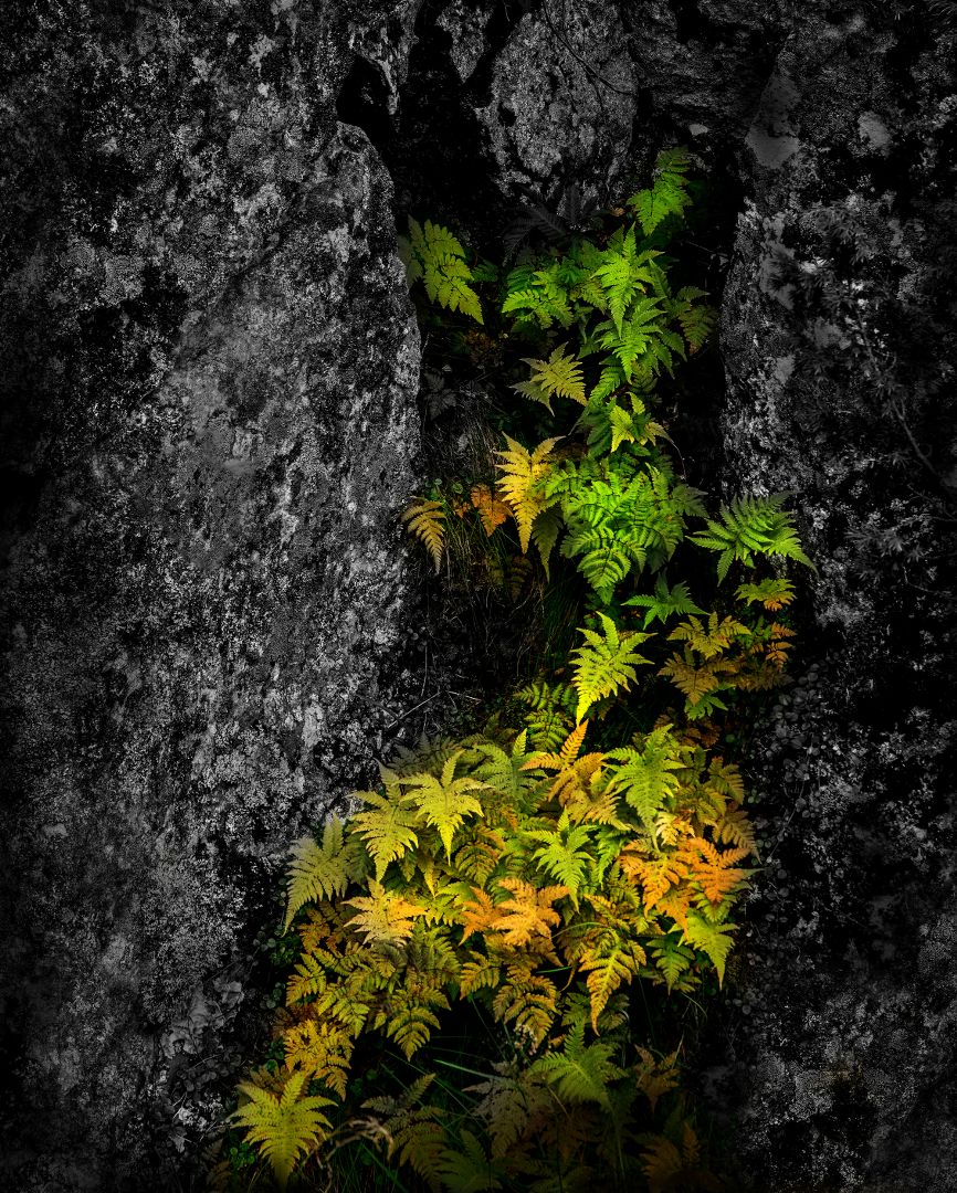 Varens groeiend op een donkere rotswand, extra benadrukt door de rotswand in zwart – wit om te zetten. Jong leven in een weerbarstige omgeving. Het grote contrast (zwart van de rotsen en het frisse groen van de varens) versterkt dat gevoel. De beginnende herfstkleuren benadrukken toch ook de vergankelijkheid. Ook de grote scherptediepte (alles is scherp) speelt een belangrijke rol. Foto Nico van Gelder