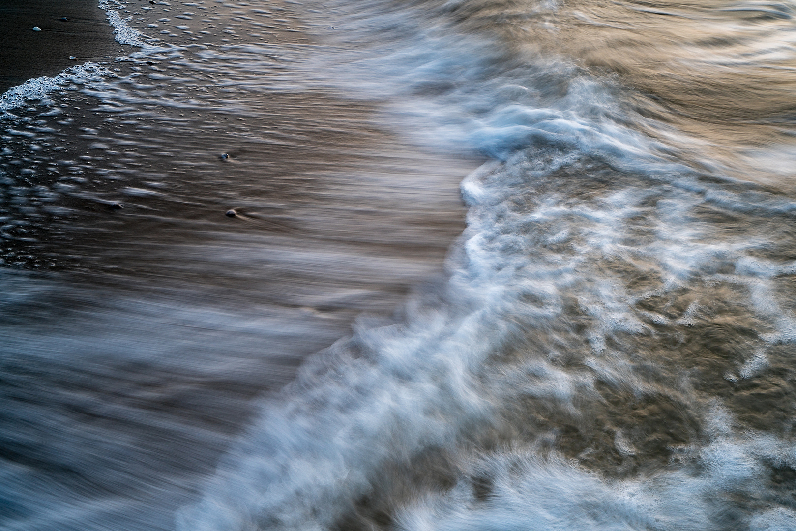 Twee schelpjes in een hele grote wereld. De zee trekt maar de schelpen houden stand. Door de lange sluitertijd wordt de beweging en de kracht van het water en ook het ‘verzet’ van de schelpjes geaccentueerd. Een korte sluitertijd waarmee je de hele scene bevriest heeft dit effect veel minder. Foto Loes Belovics