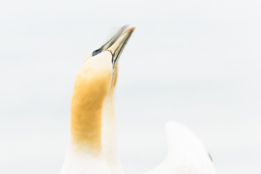 Jan van Genten. Begroetingsritueel waarbij de snavels snel langs elkaar worden bewogen. Om de beweging weer te geven is een lange sluitertijd gebruikt. Het is een high key opname wat een opgewekt gevoel geeft, passend bij de scene. Door de compositie en de beweging zijn de vogels niet zo makkelijk herkenbaar, je moet de foto op je in laten werken. Foto Rob Blanken