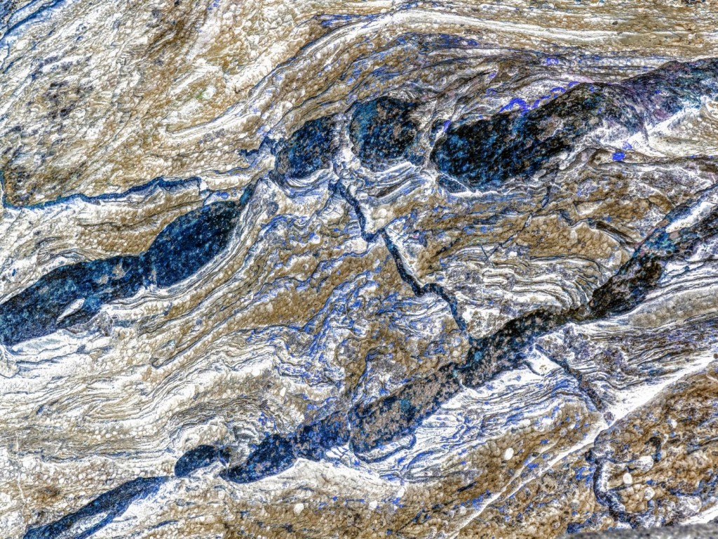 Structuren in een rots. Door de verschillende hardheden van het gesteente ontstaat een mooi en grillig patroon, dat op zich al een abstraherend karakter heeft. Door de foto om te zetten in negatief ontstaan aparte kleuren, die vervreemdend werken en die de toeschouwer uitdagen om er nog iets in te “herkennen”. Foto Nico van Gelder