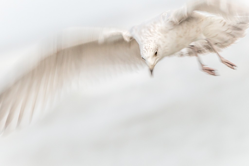 Een vliegende meeuw, zoals altijd op zoek naar eten. Eigenlijk zijn meeuwen etterbakken maar deze meeuw heeft iets vertederends. Dat komt door de kleine scherptediepte (eigenlijk zijn alleen de ogen scherp), de zachte blik (ongewoon voor vogels) maar vooral ook de high key benadering en de beweging in de vleugels. Foto Loes Belovics