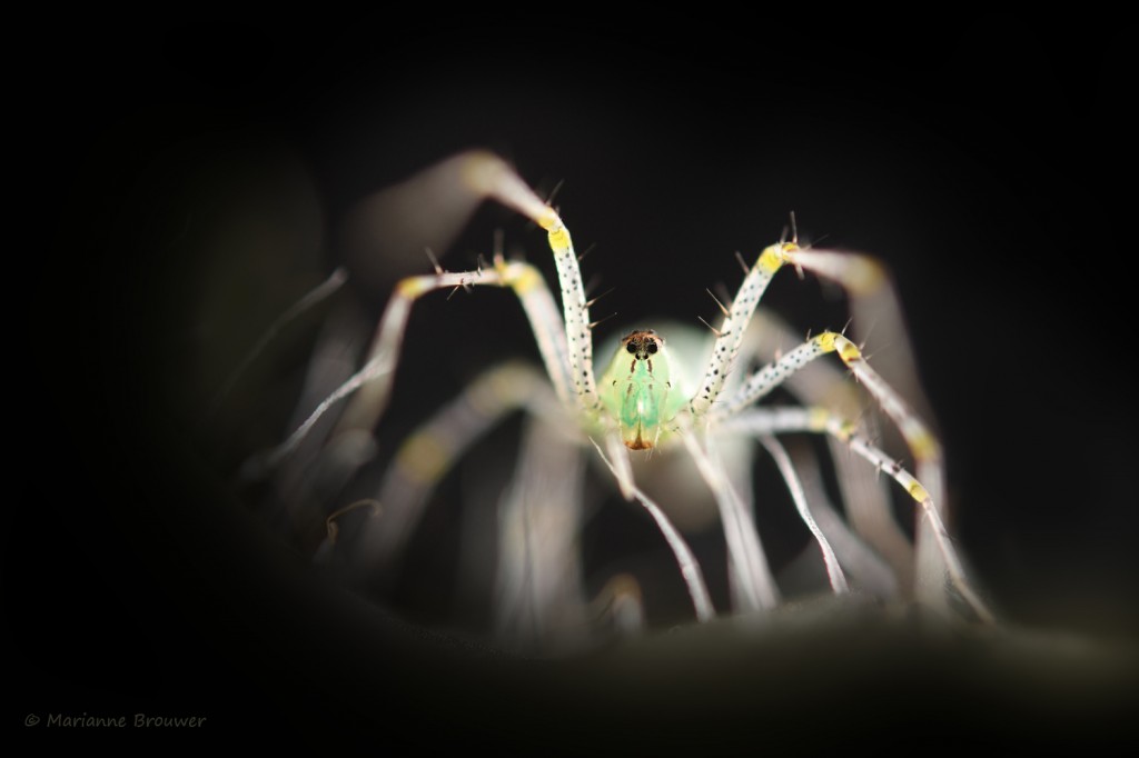 Spinnen hebben acht poten! Die hoeveelheid is het karakteristieke maar misschien ook wel griezelige aan een spin. Om dat te benadrukken is deze spin op een harig blad en met fors tegenlicht gefotografeerd. De haren van het blad versmelten als het ware met de poten van de spin waardoor de illusie van veelheid ontstaat. Foto Marianne Brouwer