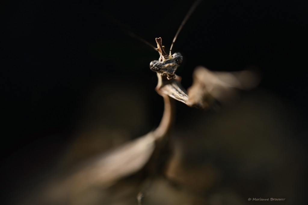 Bidsprinkhaantjes hebben een elegante houding. Dat in combinatie met beweging geeft veel dynamiek. Deze bidsprinkhaan is gefotografeerd met een 60mm lens, f11. Door het gebruik van een voorzetlens is toch een hele beperkte dieptescherpte ontstaat. Bidsprinkhanen maken vaak snelle bewegingen met hun voorpoten, bijvoorbeeld om prooien te pakken. Op dat moment is de foto gemaakt. Het lijkt alsof de bidsprinkhaan danst. Foto Marianne Brouwer