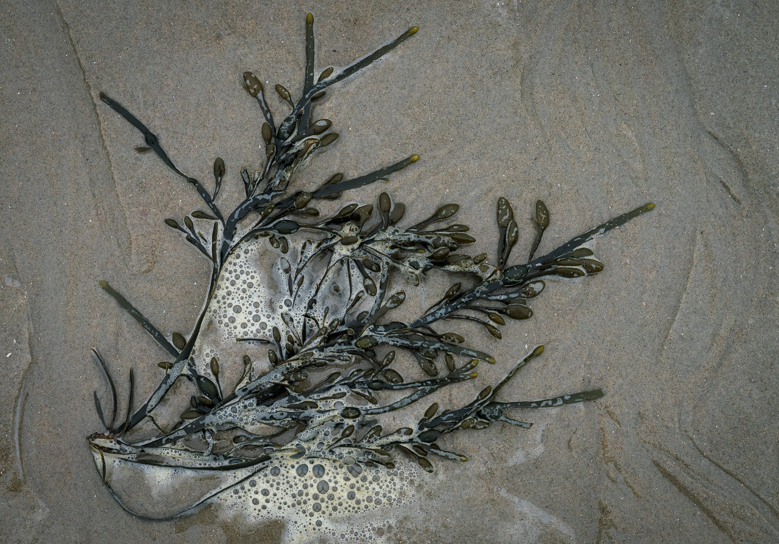 Schuim, schelpen, kwallen, krabbetjes, zeewier, zeesterren, zandstructuren, alles ligt aan je voeten… maar pas wel op dat je eigen voetstappen je compositie niet bederven!