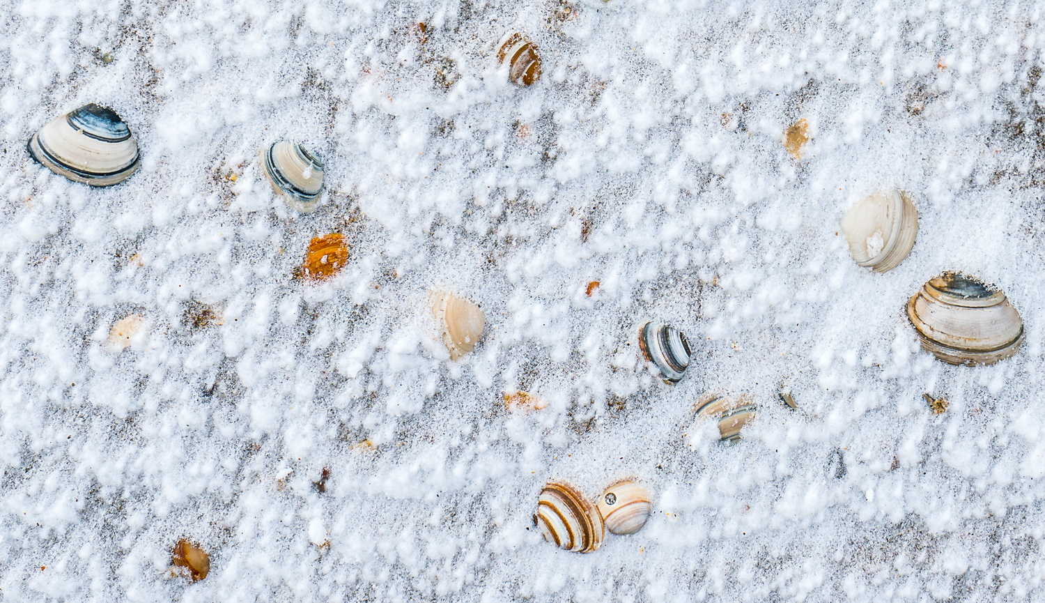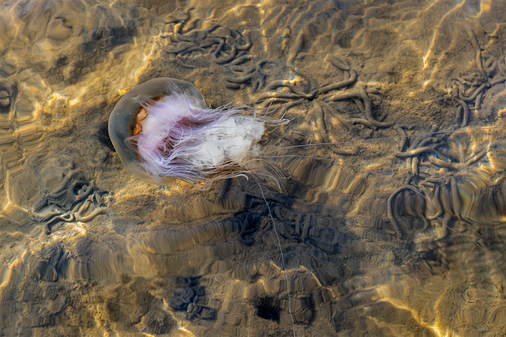 Ondertussen kijk ik ook waar ik loop, want misschien zie ik nog wel schelpen of ander strandleven. Er komen steeds meer donkere wolken binnendrijven die prachtig reflecteren in de poeltjes achtergebleven zeewater op het strand. Boven mij hoor ik de krijsende meeuwen, die meegaan met de opkomende wind.