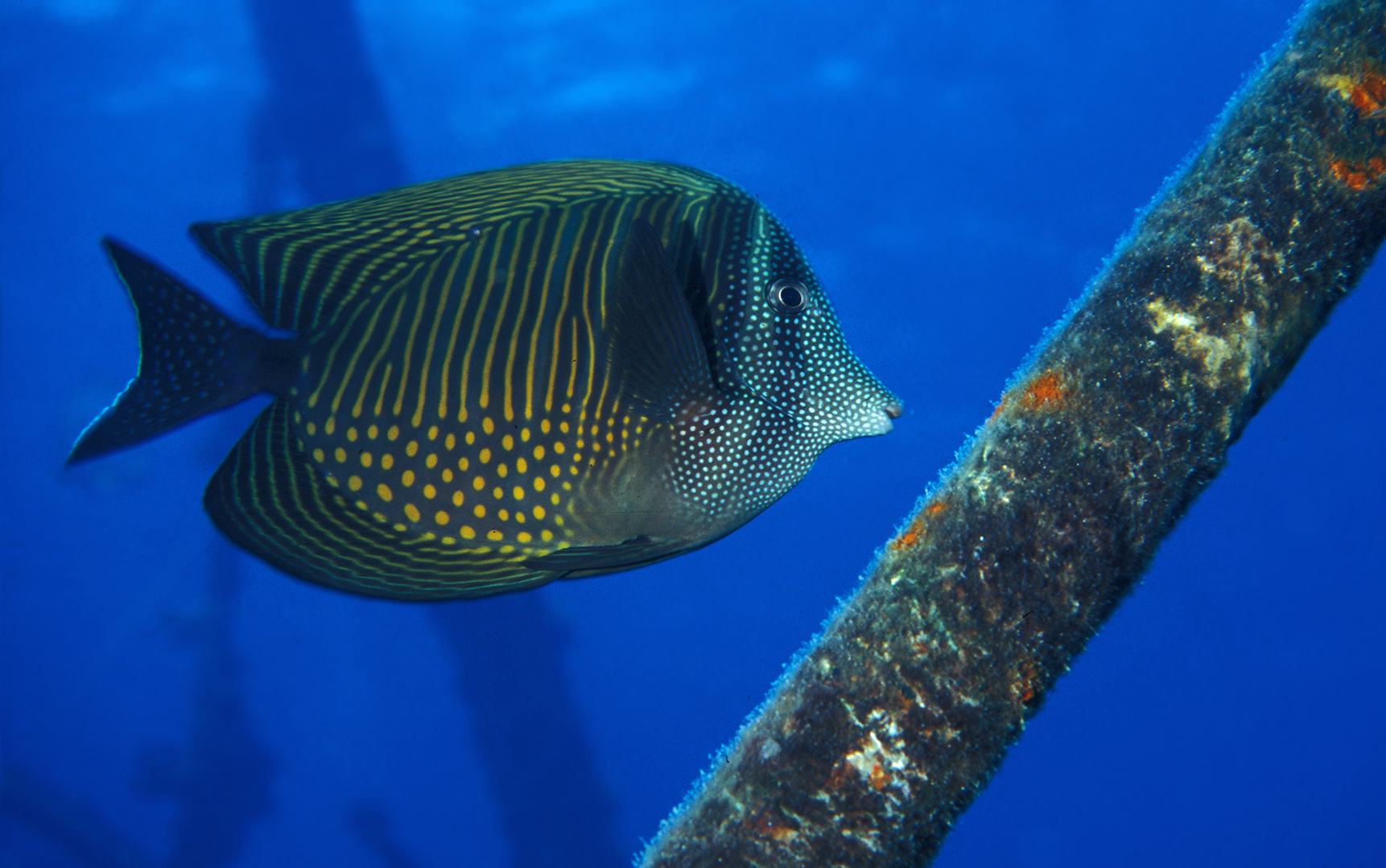 Een mooi getekende vis die knabbelt aan de wieren van een wrak