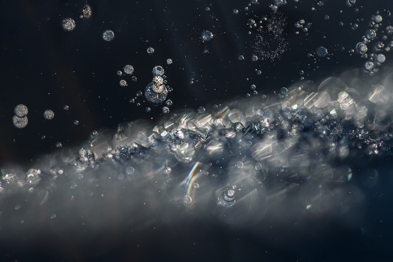 De luchtbelletjes die ontstaan waren onder het ijs bij ons tuinvijvertje trokken mijn aandacht. Dit is een meervoudige belichting vanuit de camera met aanvankelijk het beeld van de belletjes en nadien heb ik een nieuw beeld gezocht dat de schittering over het ijs accentueerde.