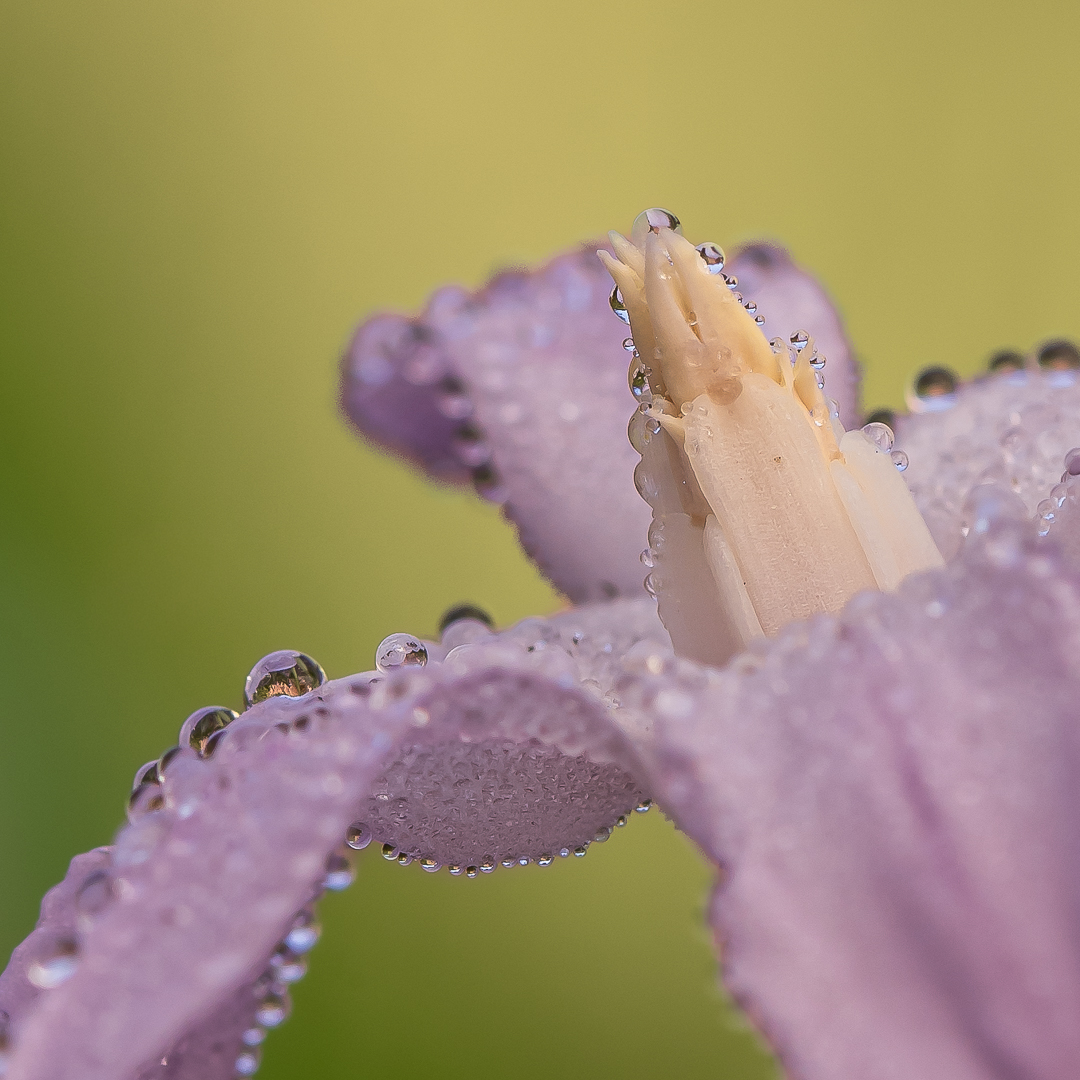 De druppeltjes hebben een mooie scherpte, zowel op het bloemblad als op het hart van de bloem. De egale achtergrond laat de druppels goed uitkomen.