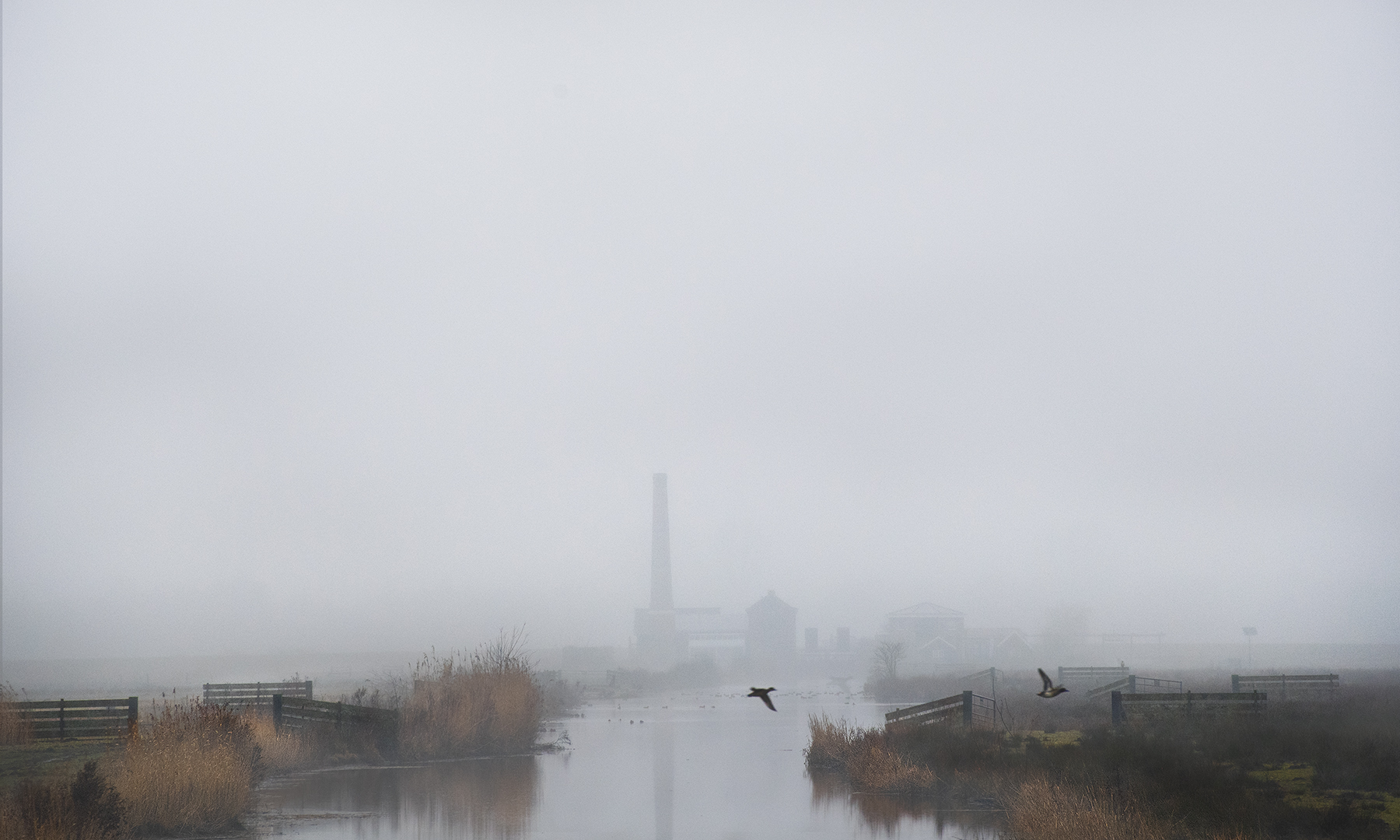 Je hebt voor een wat ongebruikelijke compositie gekozen met de lage horizon en veel mistige lucht, maar het benadrukte wel het mistige weer. Fijn doorkijkje op het gemaal omzoomd door warm getint riet.