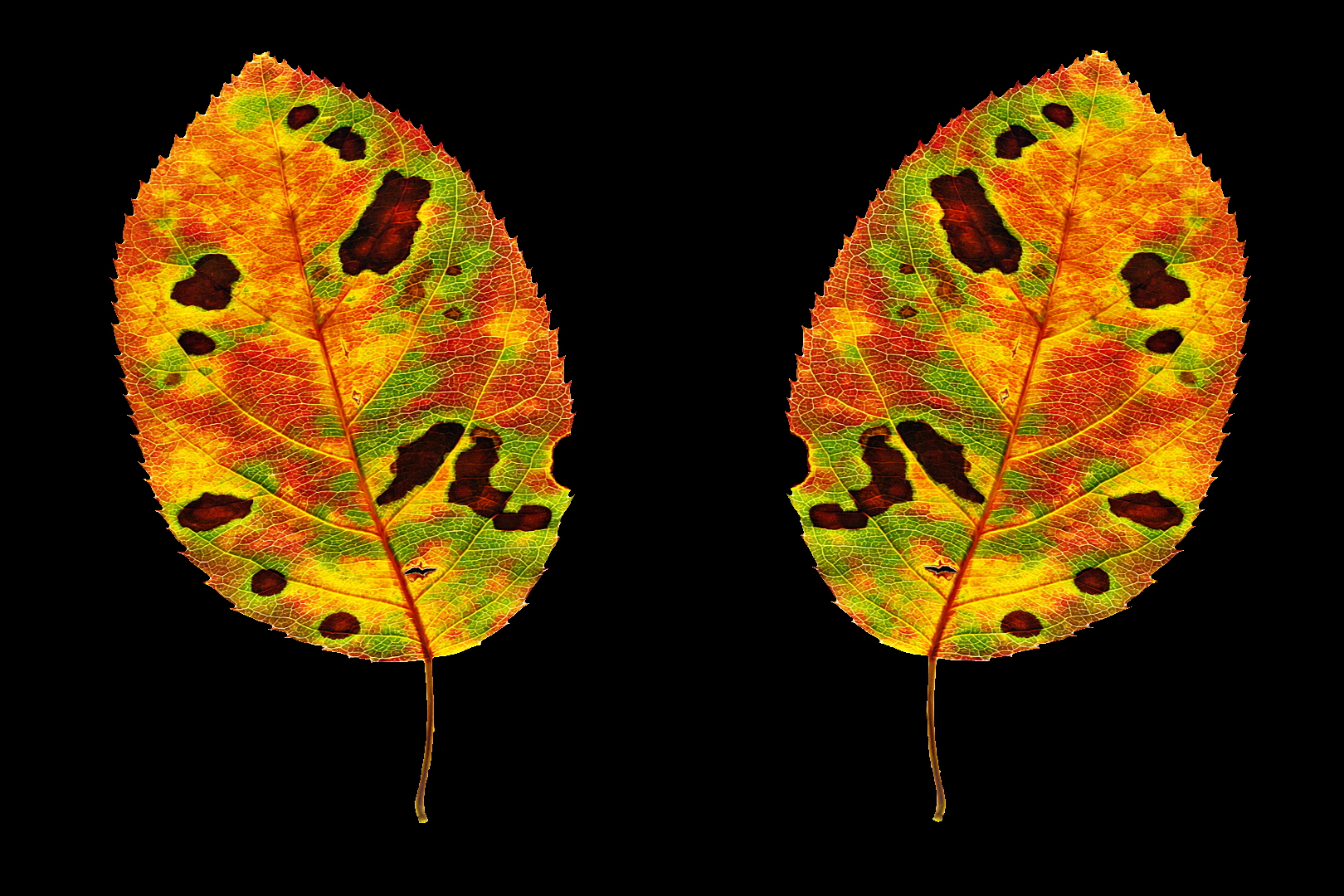 Een kleurrijk blad, waarschijnlijk van een krentenboom. Meegenomen naar huis en gefotografeerd in tegenlicht met zwarte achtergrond. Vervolgens gespiegeld met zichzelf. Hoop dat het zo wel goed genoeg is.