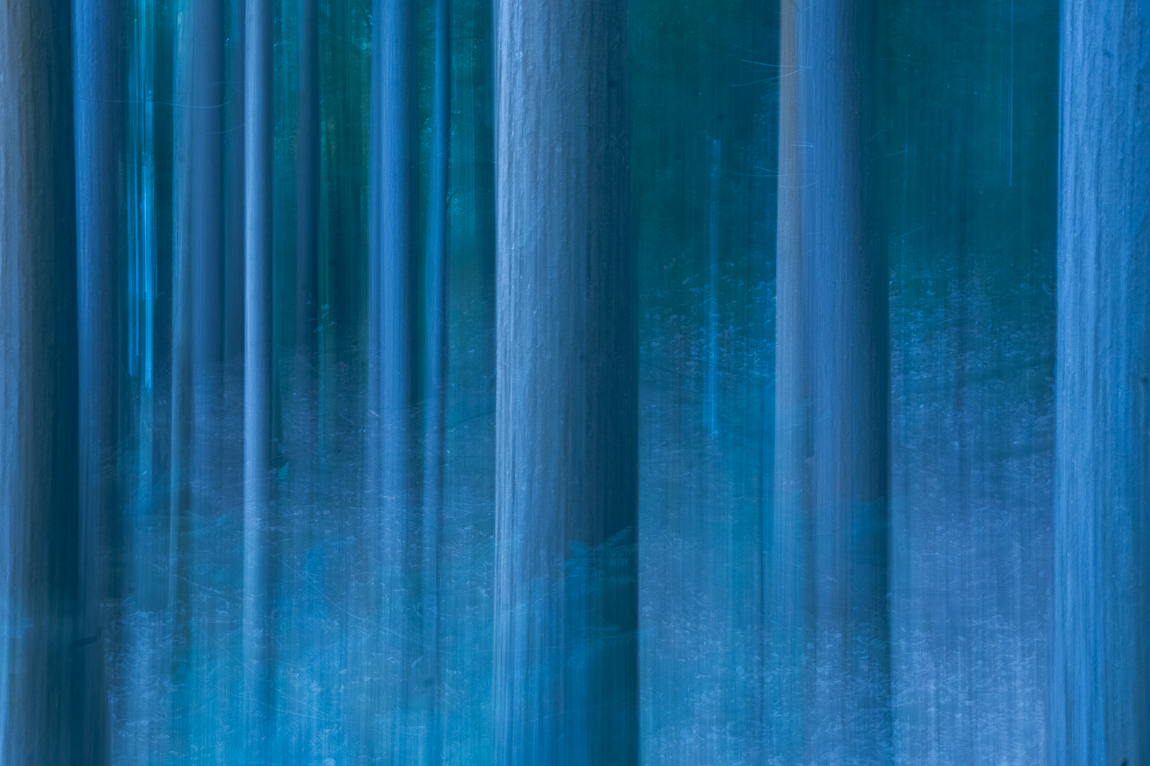 Dennenbos vastgelegd met een verticale camerabeweging. De verschillende blauwtinten — van diepgroen-blauw bovenin naar lichter blauw onderin — geven het bos een stille, bijna onderwatersfeer.