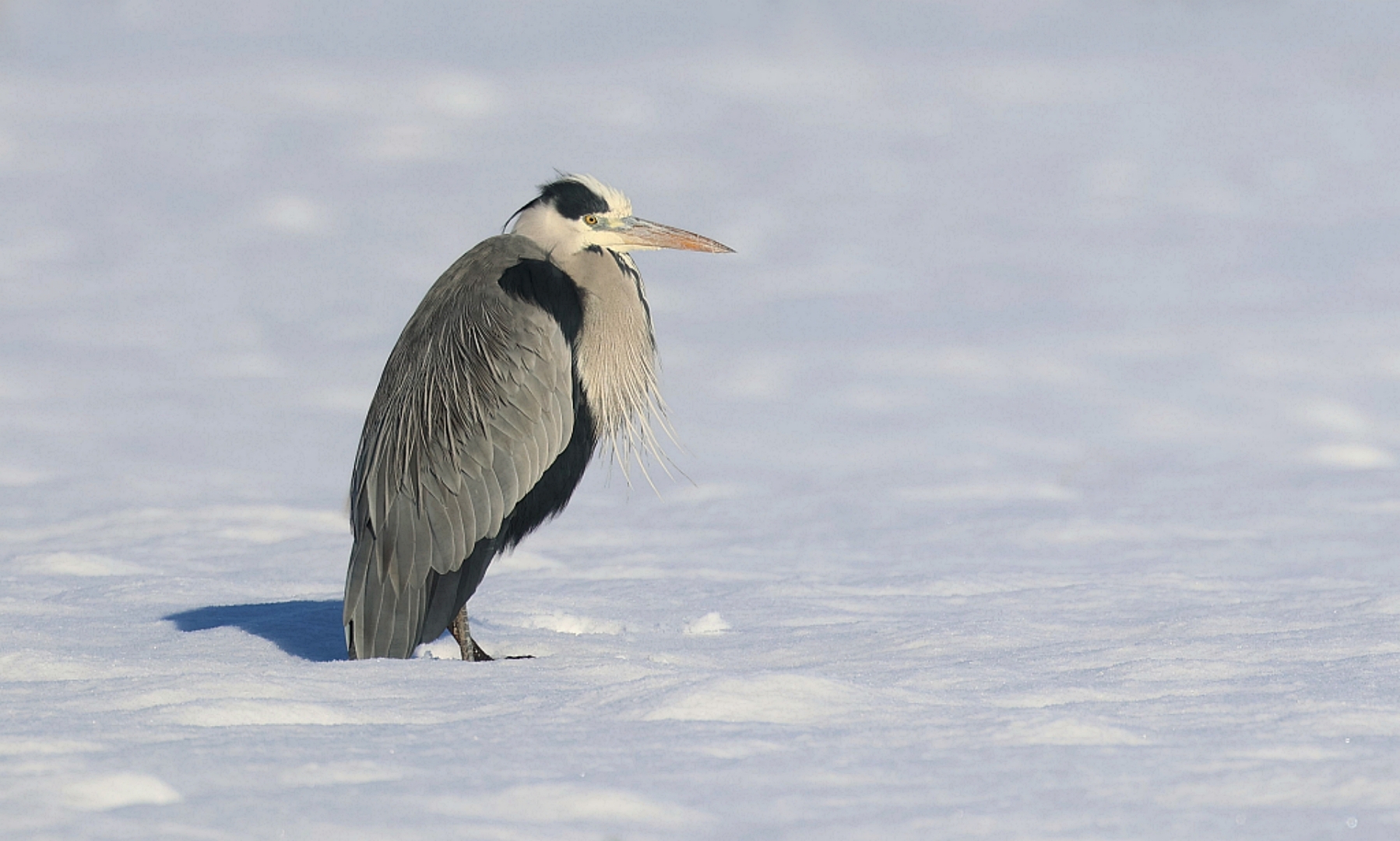 Een algemene vogel als de Blauwe Reiger levert in de sneeuw, met een zonnetje erbij, toch best een mooi plaatje op.