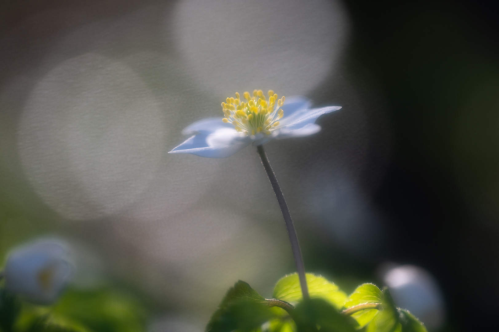 Het bosanemoontje richt zich mooi naar het licht en de bokehbubbels. goed gezien en goed gebruik van gemaakt.