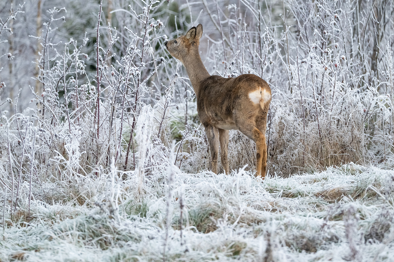 In november hadden we na een vochtige periode wat nachtvorst. de reegeit komt dan mooi uit in het witte landschap. Ze komen dan ook gelijk kijken of er al voer in hun ruif ligt. Meestal krijgen ze dan wat resten appelschillen en brood. Ze weten het heel snel en zwerven regelmatig rond ons huis