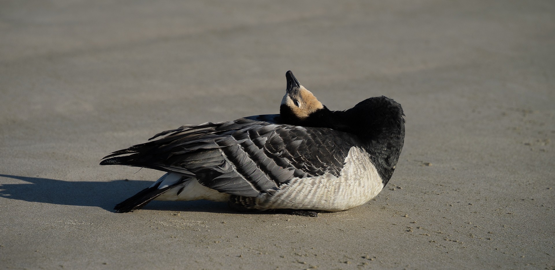 Op het strand van Terschelling trof ik deze brandgans aan die besmet was door de vogelgriep. Kenmerkend zijn de stuiptrekkingen, benauwdheid, sloomheid en het feit dat ze niet schuw (meer) zijn.