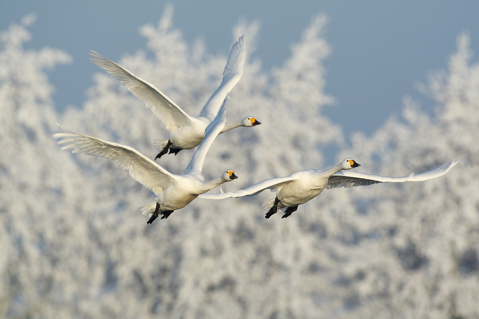 Wat een gelukje en wat een mooie zwanen zijn dat toch, de kop vd rechterzwaan is volgens mij scherp, bij de andere zwanen niet maar dat vindt ik hier niet zo erg omdat ze in formatie vliegen. Een kleiner diafragma had dat wel op kunnen lossen, maar daar had je hier natuurlijk geen tijd voor. Mooie achtergrond door die besneeuwde boomtoppen.