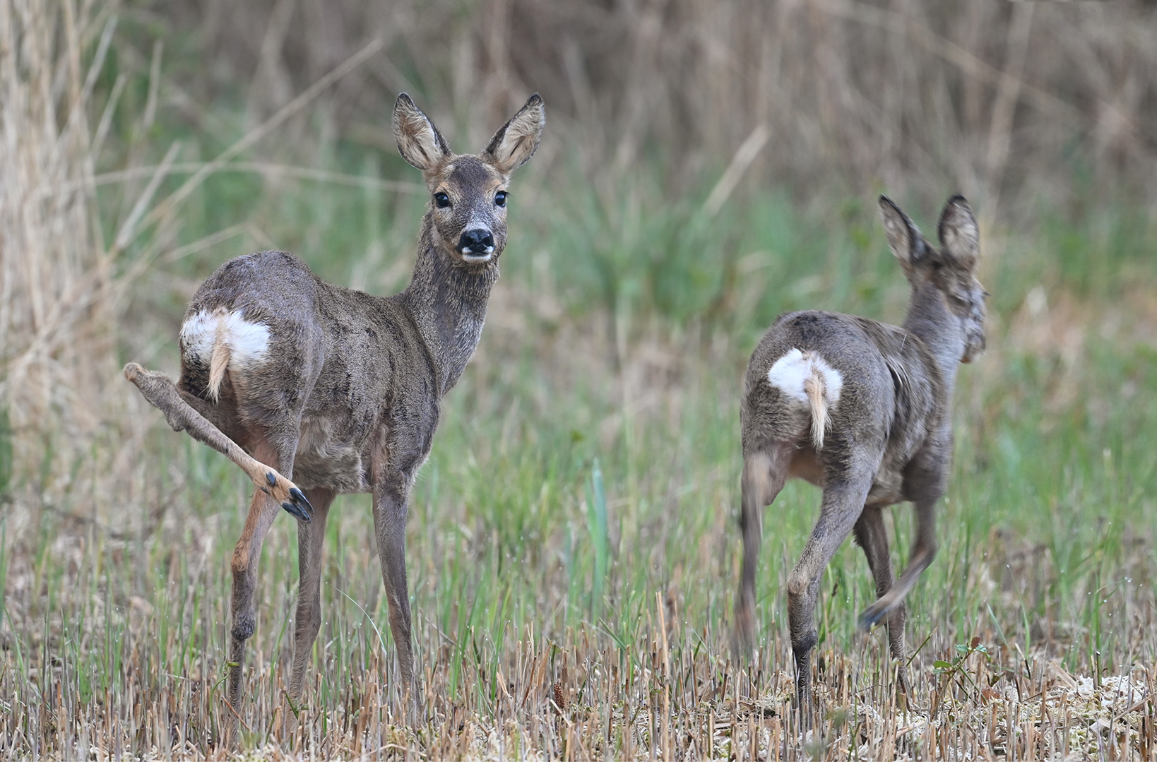 De compositie is inderdaad krap maar werkt wel. Het ree dat omkijkt lijkt een gebroken poot te hebben, hopelijk kan ze zich daar mee redden, het ziet er in ieder geval niet fijn uit.