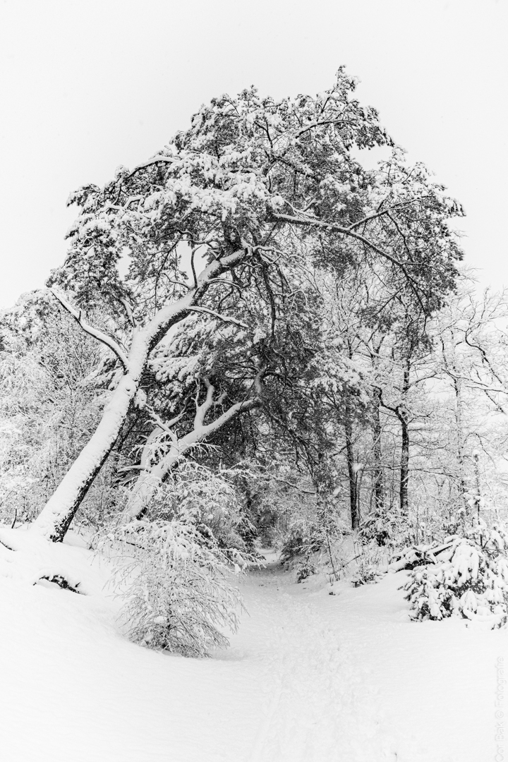 Met al die sneeuw in het bos ziet alles er direct anders uit. Foto omgezet in zwart wit en wat schuifjes heen en weer geschoven en zo ontstaat er volgens mij een etstekening van deze bomen.