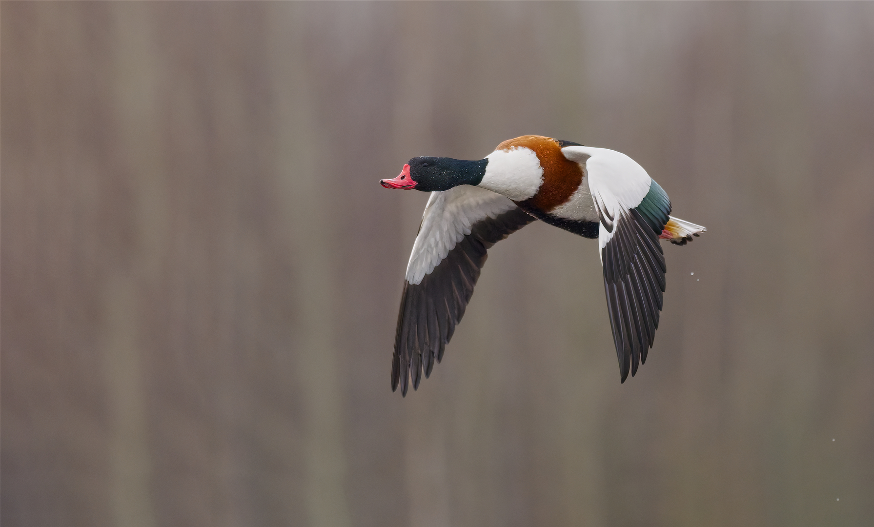 Fraai vliegbeeld van deze bergeend, de druppeltjes op de kop en de fijne rustige achtergrond zijn een meerwaarde.